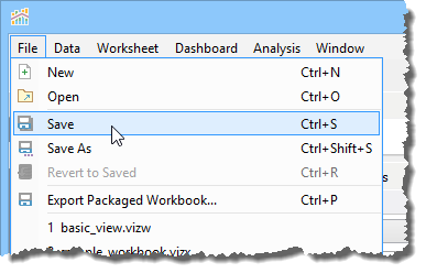 To save your work in Visual Analytics you can click the [Save] icon in the Toolbar or the [File > Save] menu.