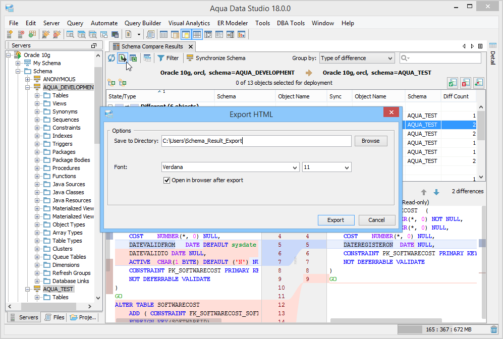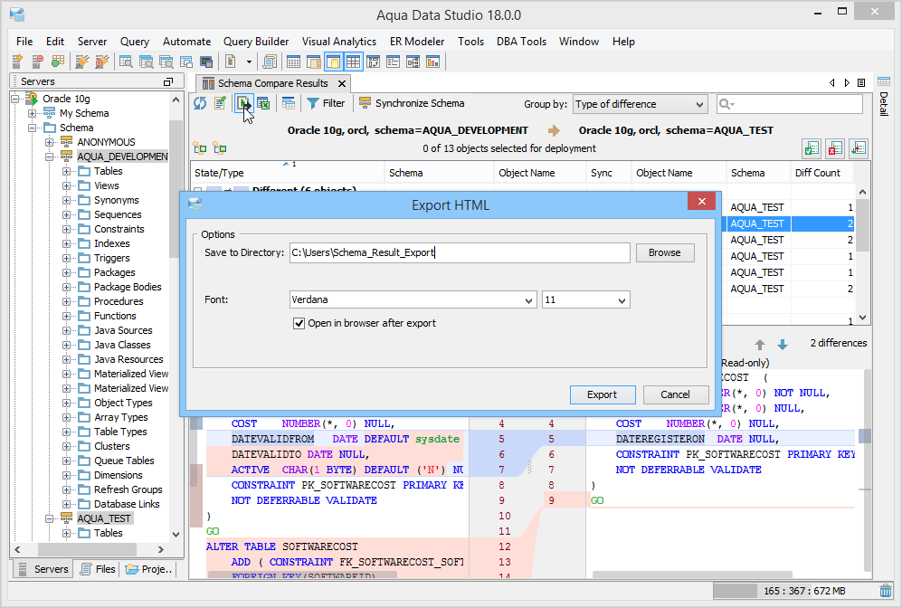 Exports the schema compare result to HTML. You can preview the result in your default browser after Aqua Data Studio saves the file at the specified location. |