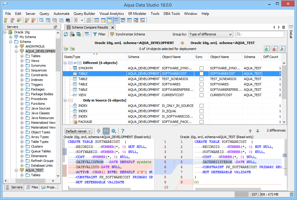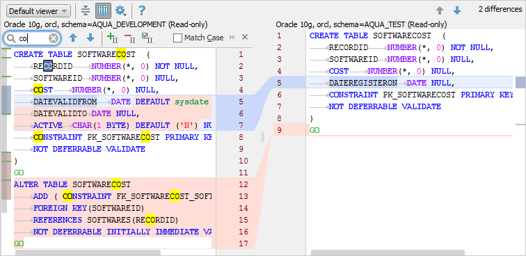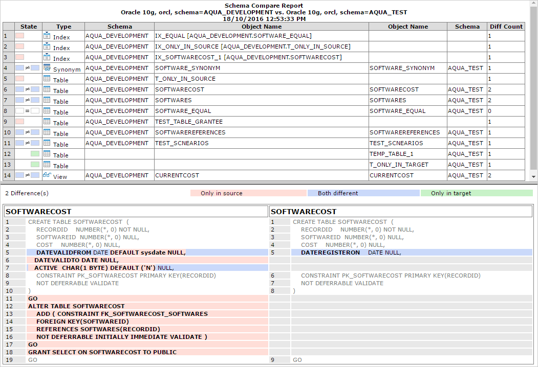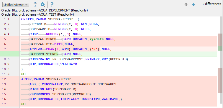On selecting an object, you can view the source and target differences in different color codes in the SQL Differences pane. The script differences are shown in the default viewer where the source and target scripts are positioned side-by-side.