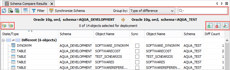 Allows multiple object selection ( You will not see these icons if you have launched the Schema Compare Results tab from the Schema Compare Tool. |