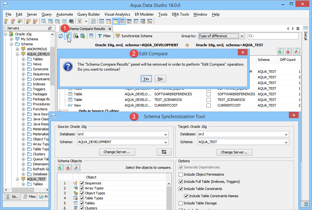 Allows changing data sources and adding or removing schema objects and schema options from schema compare. When you click this icon, Aqua Data Studio retrieves a snapshot of the schema synchronization dialog cached in memory and launches the Schema Synchronization Tool. See Attachment. If data cached in memory is out-of-date, then Aqua Data Studio will show an error message for DDLs that could not be generated. Therefore, we recommend performing a refresh before editing comparison result. |