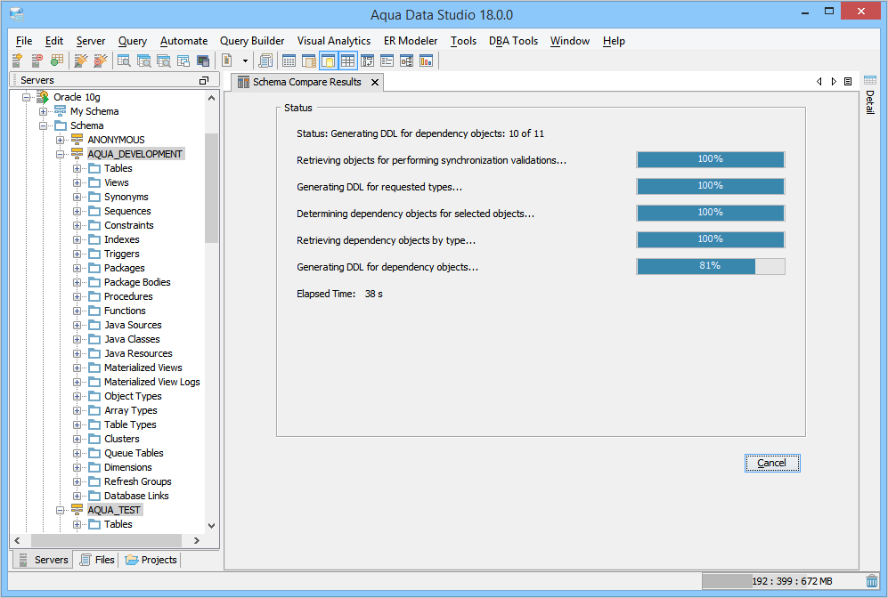 If you click Cancel this operation, the Schema Compare Results dialog is displayed. You can choose to cancel the current compare operation, abort and start a new compare, or continue with the existing compare operation.