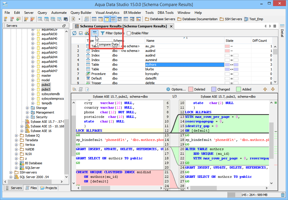 If you want to change the default color codes, then on the Aqua Data Studio menu bar, click File > Options > Compare, and then choose the color code to change (Additions, Deletions, Changes).