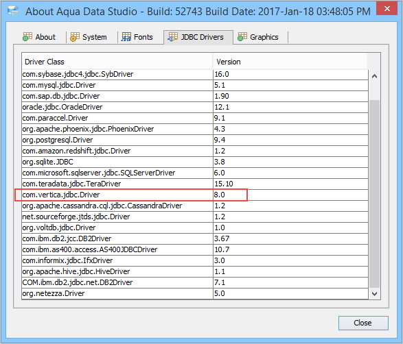 To update the Aqua Data Studio JDBC drivers for Vertica you need to overwrite the Aqua Data Studio vertica.jar file. Below is a listing of the Aqua Data Studio library directory [ADS_INSTALL]\lib\drivers\ ...