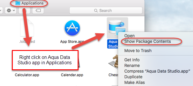 To get to the driver location in OSX, select "Finder". Select "Applications". Locate the Aqua Data Studio app and right click on it. Select "Show Package Contents"