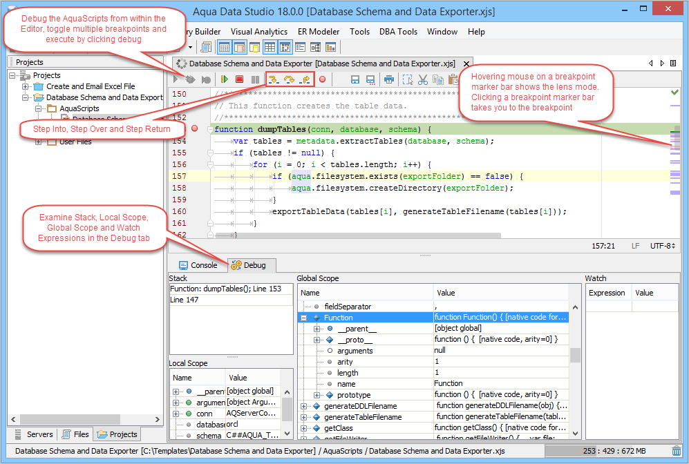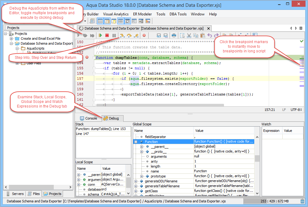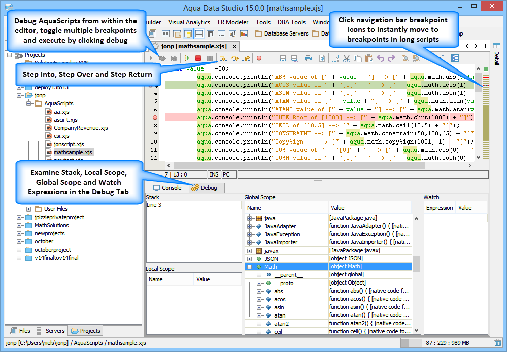 Debug AquaScripts within the Editor: Just like Aqua Data Studio's DB2, MS SQL Server, Oracle and Sybase SQL debuggers, AquaScripts can be stepped through during execution to examine results and debug errors. Functions can be evaluated and parameters entered as the debugging process continues. Breakpoints can be set and used to pause execution to examine values and parameters. The debugger highlights the breakpoints, indicates which one currently pauses the execution and sets bookmarks in the navigation bar so that they can be viewed quickly when there are multiple pages worth of lines to debug.