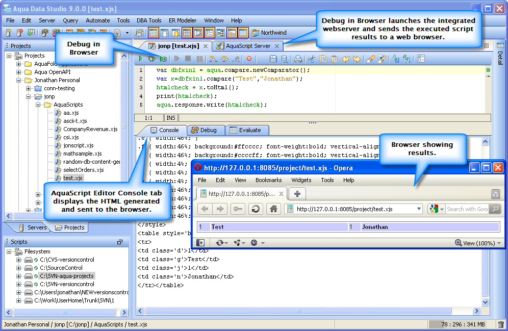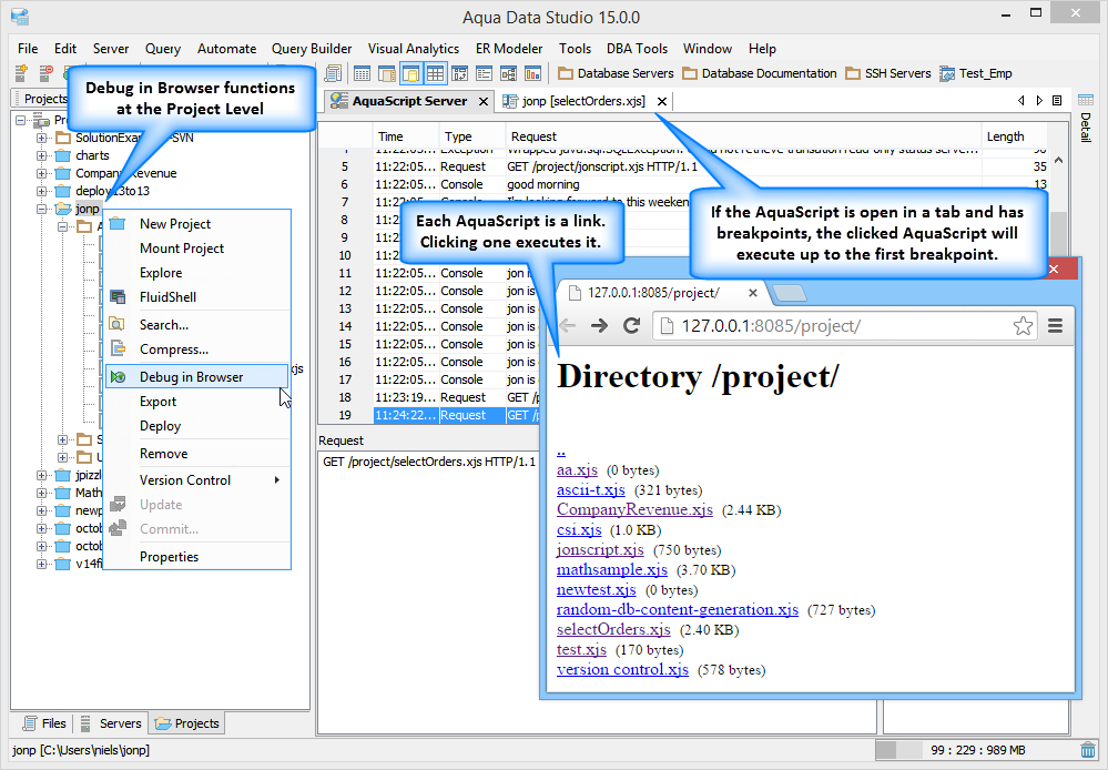 Execute Scripts in the Editor: With the AquaScript editor, you are able to execute an AquaScript in 3 different modes from the editor toolbar. The 3 modes include: Execute in console, Debug in Console and Debug in Browser. The Execute in Console allows the user to execute the script with the Console window as the primary out to the user. Debug in Console allows the user to debug a script executed in Console mode. The Debug in Browser will launch a basic webserver within Aqua Data Studio and allow a browser to request the execution of the script, in which case the script may output to the console or to the aqua.response object which will be sent to the browser for HTML rendering. The latter is to allow a user to write and debug scripts that will be deployed to Aqua Data Server as a web-based script or application.