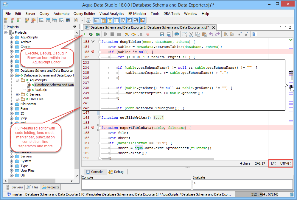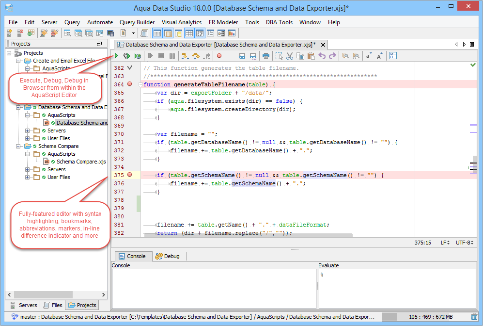 AquaScript Editor: The new AquaScript Editor is a complete and fully functional editor for the JavaScript programming language. It provides autocompletion, syntax coloring, bookmarks, abbreviations, find/replace, incremental search and more. Editing scripts for Aqua Data Studio is as simple as writing JavaScript. The fully-featured editor optimizes the script creation process. The AquaScript Editor takes its syntax highlighting cues from the JavaScript/AquaScript Editor Options.