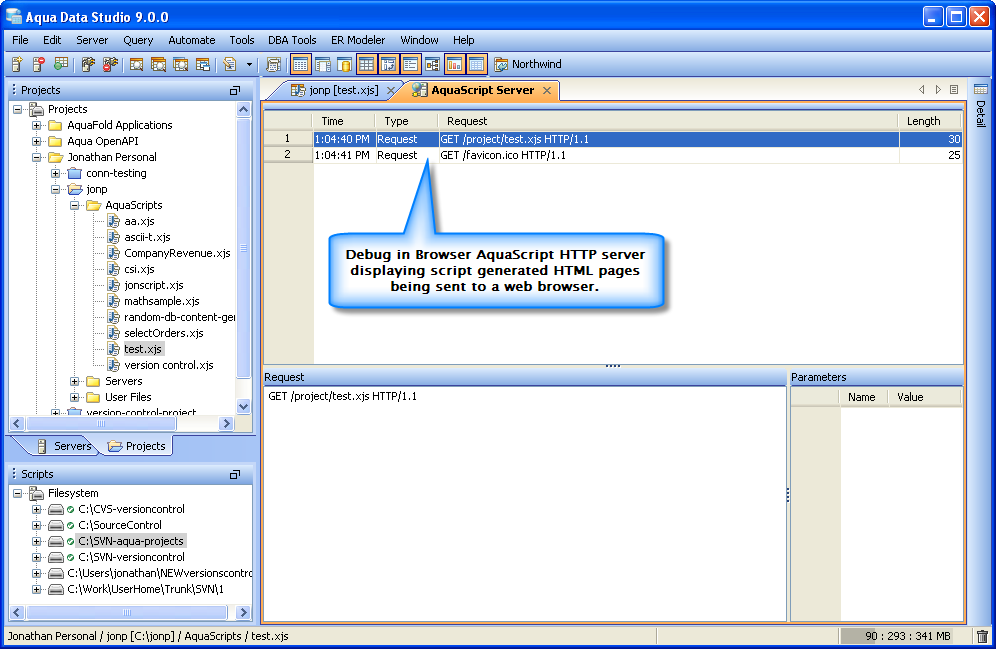 Debug AquaScripts within a Web Browser: When debugging in the browser, the built-in HTTP server will provide an interface in a tab document within ADStudio. The interface will display the HTTP requests processed. The HTTP requests include which scripts that are executed, with the parameter name value pairs that are passed to the executing script.