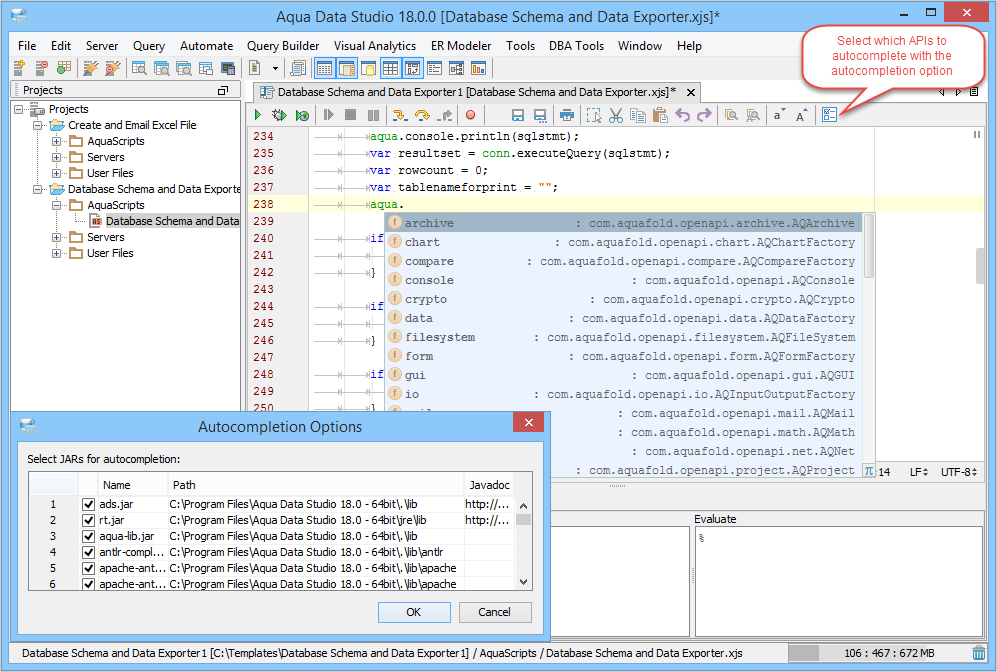 Autocompletion & Syntax Coloring: The editor has the ability to index any Java jar file to be used in autocompletion and syntax coloring. The stubs and indexes are stored in the <USER_HOME>\.datastudio\openapi folder. By default, the JVM rt.jar and the Aqua Data Studio ads.jar file are indexed. The user may choose to index other jars, such as their own proprietary libraries by selecting the options button in the editor toolbar, which allows the user to choose from a list of jars in the application class path. The indexing is done in the background and a status message is displayed in the application status bar. Once the indexing is complete, the user will have full access to the index jars for autocompletion and syntax coloring. When the application is started, if it detects that any of the index jars have changed, it will reindex the jar to synchronize the changes. The autocompletion may be triggered with a CTRL-space keystroke.