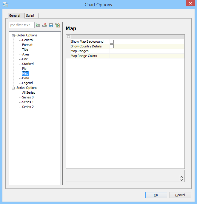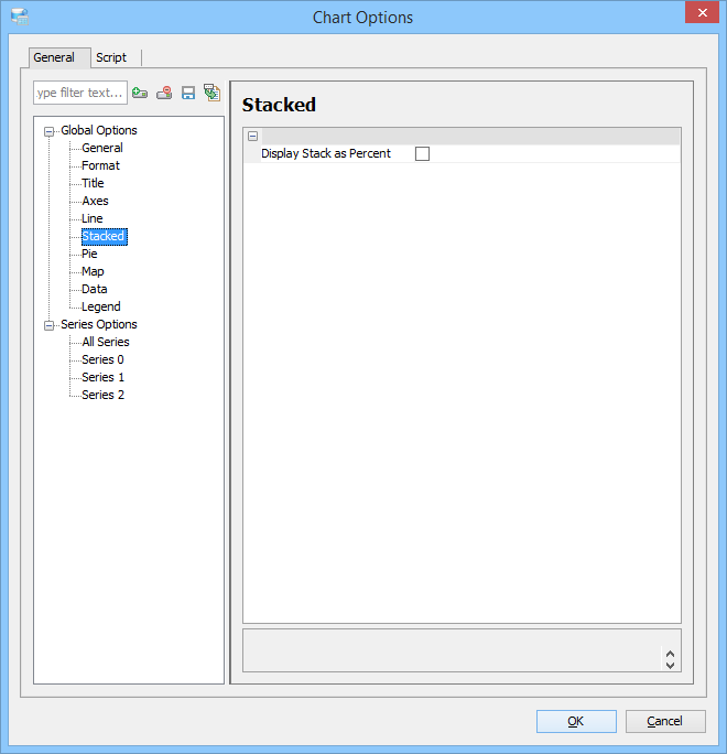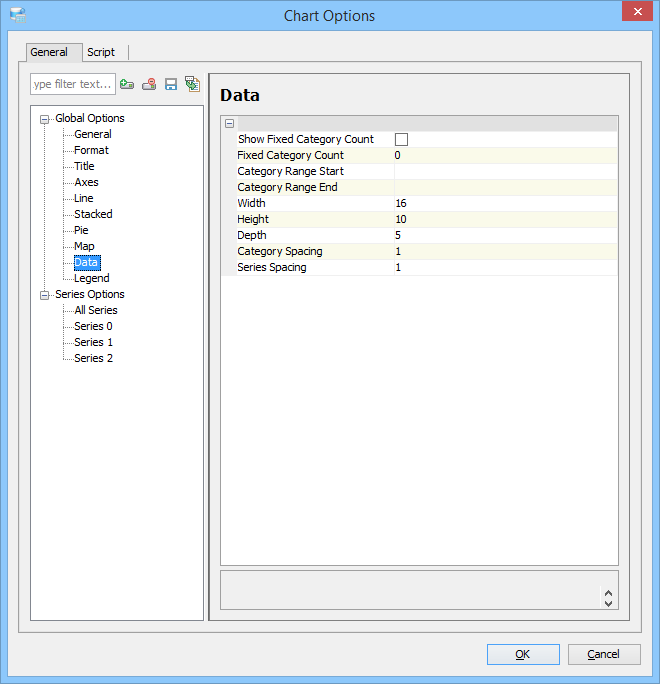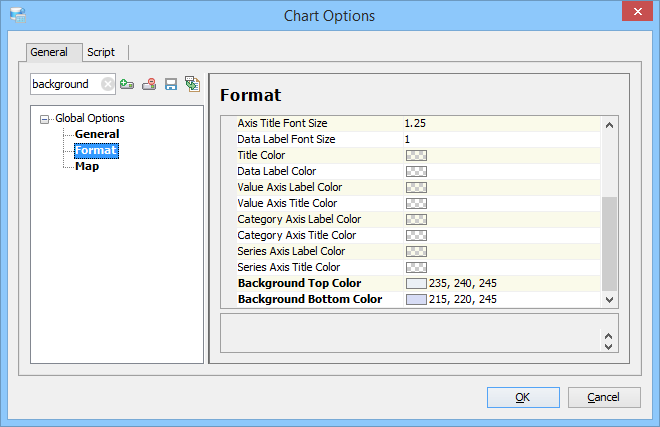 Chart Options for Aqua Data Studio contain a complete set of variables and values to alter the chart as needed, including background color, chart title, label distance, axis titles, category axis number format and much more. Series Options ( Advanced Chart Options ) information is presented at the bottom of this page. It is possible to search the chart options using the field at the top left of the Chart Options Dialog. Any matching text found in an option section ( Format, Title, Axes, etc.), option name or option description gets highlighted in the section and bolded to make it easy locate where your search term has been found.