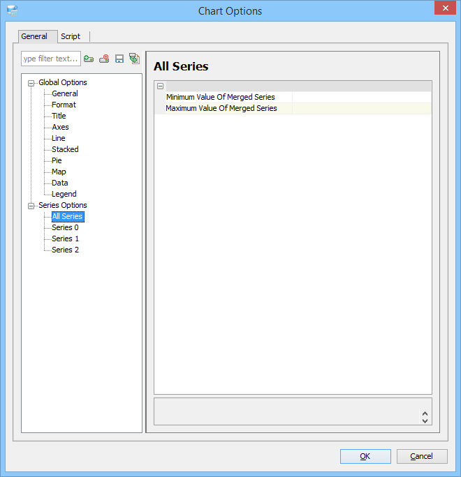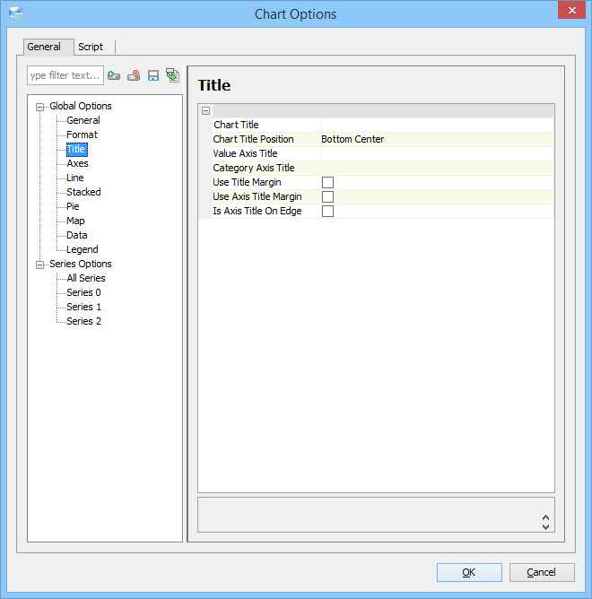 Chart Options for Aqua Data Studio contain a complete set of variables and values to alter the chart as needed, including background color, chart title, label distance, axis titles, category axis number format and much more. Series Options ( Advanced Chart Options ) information is presented at the bottom of this page. It is possible to search the chart options using the field at the top left of the Chart Options Dialog. Any matching text found in an option section ( Format, Title, Axes, etc.), option name or option description gets highlighted in the section and bolded to make it easy locate where your search term has been found.