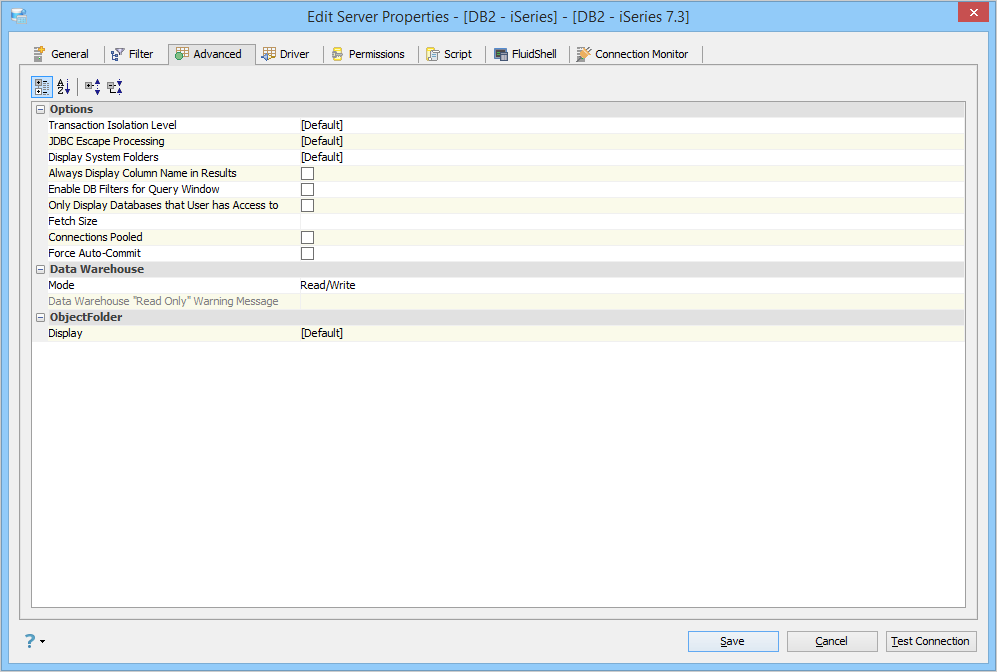 Edit the Server Properties to use Advanced Properties in Aqua Data Studio: