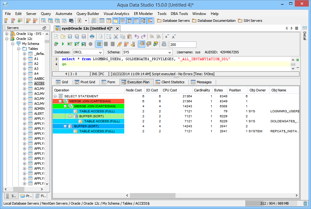 Aqua Data Studio’s Visual Explain provides visual display of an execution plan for a query, allowing for query tuning to enhance query and server performance. ADS provides a "Show Execution Plan" option in the Main Application Toolbar. If this option is enabled an execution plan will be generated for each query executed in the results Execution Plan tab. Multi-execution plans are supported and executing a script will generate multiple execution plans. Aqua Data Studio also provides an "Execute Explain" button in the query window which will generate an execution plan for the current query or the highlighted queries in the Query Analyzer window. The visual explain plans have an identical layout for most databases except for the row information for each node operation, which contains specific column information according to the specific database server and version. There are 2 ways that ADS can be used in comparing execution plans of queries. The first option is to "Execute Explain" on 2 highlighted queries at the same time, which will give you 2 visual explains in the results to compare. The second option is to open 2 popup Query Windows and execute a single query in each window to be compared side-by-side. Before you begin using visual explain you may want to review the default settings according to your database vendor and version. You may change the settings in the File->Options->Explain tab. It is also possible to add execution plans to the Visual Explain Whiteboard. Right Click on the contents of the Execution Plan to add that Plan to the Explain Whiteboard for quick comparison of execution time from multiple queries in one window. Explain Diagrams can be generated from Execution Plans and saved as JPEG or PNG images for sharing. Each operation's details can be viewed and the color of critical operations can be altered to assist in highlighting important bottlenecks and steps in the execution process. Diagram objects can be repositioned to create meaningful images for others. Microsoft SQL Server does not have any configurable settings and works from installation by only enabling the execution plan. For Oracle, the default settings should also work from installation. ADS will create and drop an explain table every time the user executes a query or executes explain with a dynamic explain table name using the session id, so the explain tables are not confused by simultaneous users. If you would like to manually configure and create an explain table for all of your users, you may do so and have all ADS users configure their ADS installation to access that specific table. DB2 should also work out of the box, which by default will create the explain tables if they do not exist but will not drop them. The reason for the different configurations for the 3 different databases is because of the different implementations by the database vendor. Microsoft SQL Server’s explain plans can be easily enabled by issuing an SQL statement which will return explain plan resultsets. Oracle allows a user to execute an EXPLAIN statement which provides an option to place the explain data in an explain table of the user’s choice. DB2 also provides an EXPLAIN statement which will only insert data into a defined explain plan table. The issues arise in supporting explain plans for concurrent users. The ADS Oracle and DB2 LUW explain implementations will create explain data in the explain tables identified by a Globally Unique Identifier (GUID) and a statement id to ensure concurrency. ADS supports execution plans for Oracle, DB2 LUW, DB2 z/OS, Microsoft SQL Server, MariaDB, MySQL, PostgreSQL, Redshift, Greenplum, ParAccel, Teradata, Teradata Aster, Netezza, Sybase and Hive, Spark and Impala distributions. Oracle and DB2 support explain plans through explain tables, and Microsoft SQL Server supports them through returned resultsets. The Visual Explain Plan offers insight into the execution of SQL Statements and helps the user isolate potential performance bottlenecks. Each operation (Join, Sort, Index Scan, etc) is displayed with statistics about the resources required to perform the task. When enabled, coloring of operation costs mark bottleneck issues.The Explain Plan grid has several right click pop-up menu options for viewing the results in different ways and highlighting areas of interest:
