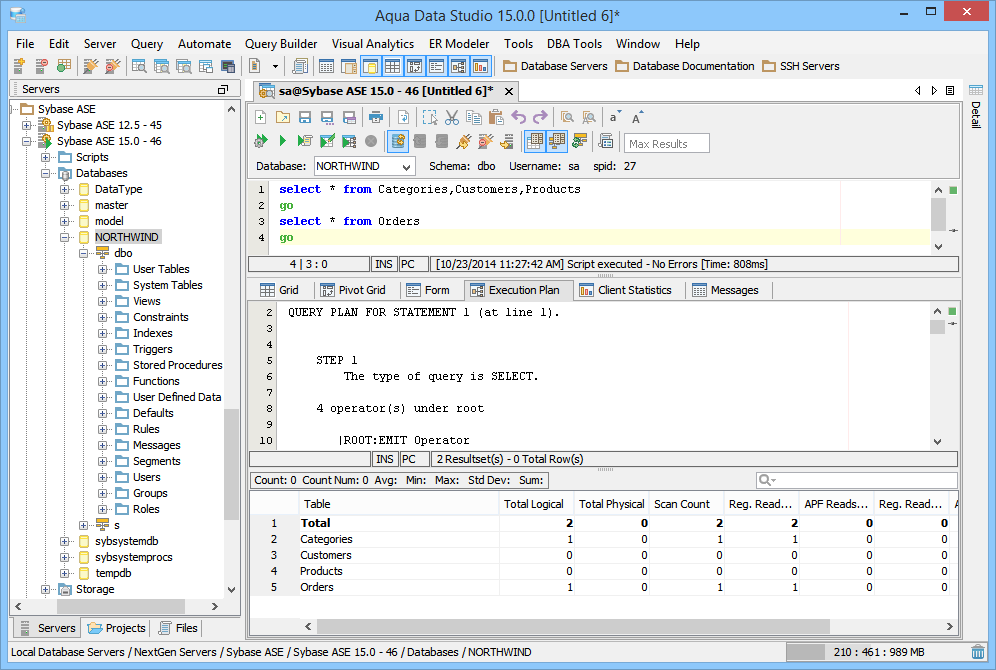 Explain Plan for Sybase 12.5, 15.x and 16.x When executing a query, it’s possible to view Execution Plan for Sybase 12.5, Sybase 15.x and Sybase 16.x as TEXT or XML based on the type selected in File > Options > Visual Explain > Sybase ASE Visual Explain Plan. Explain Plans are available by executing an explain by clicking the "Execute Explain Plan" button in the Query Analyzer toolbar, and by enabling "Show Execution Plan" for Results in the Main Application Toolbar when running a query in a regular fashion. TEXT Explain The TEXT Explain option displays a text formatted version of the explain plan, with an associated Explain grid underneath it. There are columns within the grid for Total Logical Reads, Total Physical Reads, Scan Count, Regular Reads Logical, APF Reads Logical, Regular Reads Physical, APF Reads Physical and APF IOs. The query will not be executed when the "Execute Explain" button is used. XML Explain With the XML Explain option selected, the Explain Plan displays a diagram which allows clicking nodes to view details for those nodes in the Details tab. Mouse hover over nodes also produces a tool-tip containing statistics for that node. The query will be executed when the "Execute Explain" button is used. Important: Keep in mind that executing an explain in the XML Explain mode on an INSERT, UPDATE or DELETE statement will affect your data. The Details tab displays information about the currently selected node in the Diagram, including information on