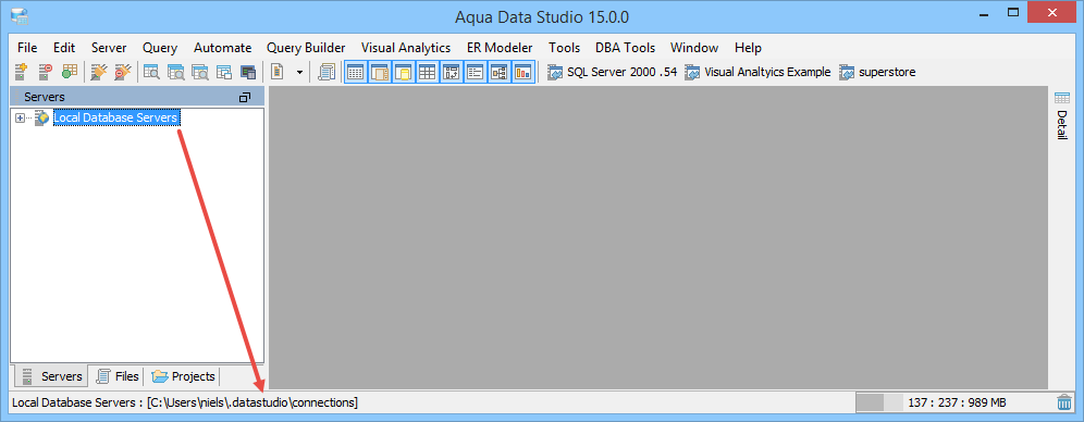 If you've suddenly lost all of your registered servers, it's possible that an environment variable for your USERPROFILE changed recently. To check where Aqua Data Studio is looking for your connection files, click on the Schema Browser tree node "Local Database Servers" at the very top of the Schema Browser. At the bottom left of the Main Application window the status bar will indicate the path Aqua Data Studio is currently using for its connection files.