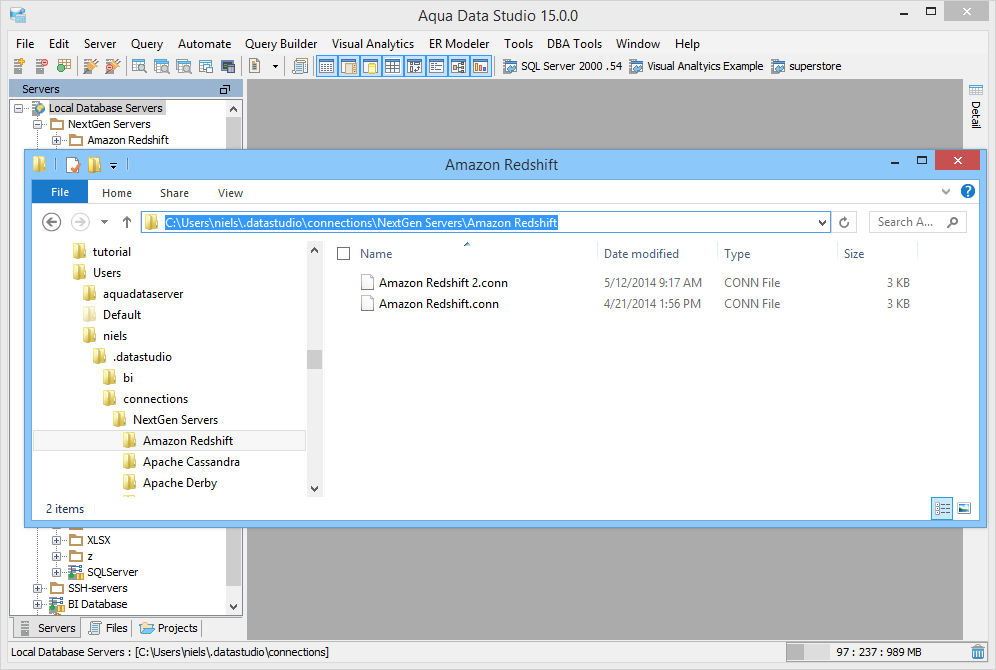 Aqua Data Studio's settings, options, connection files and configurations are designed to be easily backed up, copied and modified. It is possible to transfer all or some of the files which are used for database server and SSH server registrations to another user or another computer. The locations of these files vary based on the Operating System.