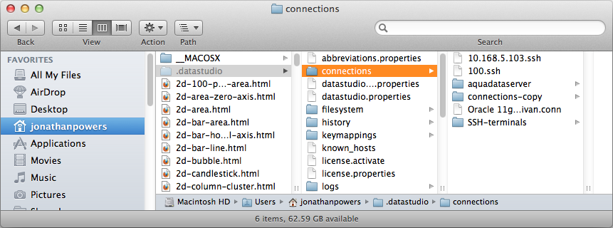 All database and ssh server connection configurations are stored in the \.datastudio\connections directory and sub-directories, with a connection file for each server in the appropriate directory. Users may exchange and share server connections by transfering individual files for each server.