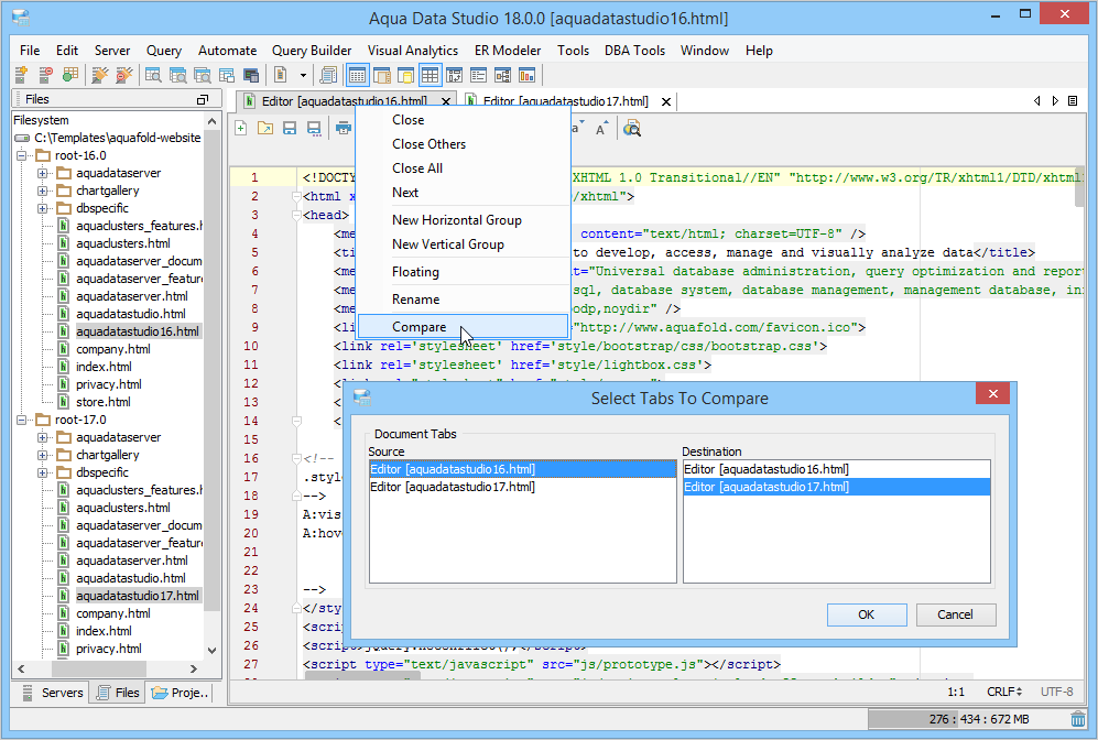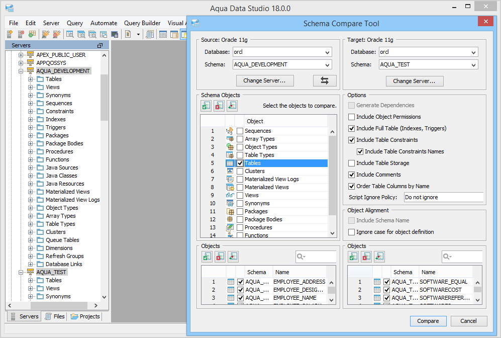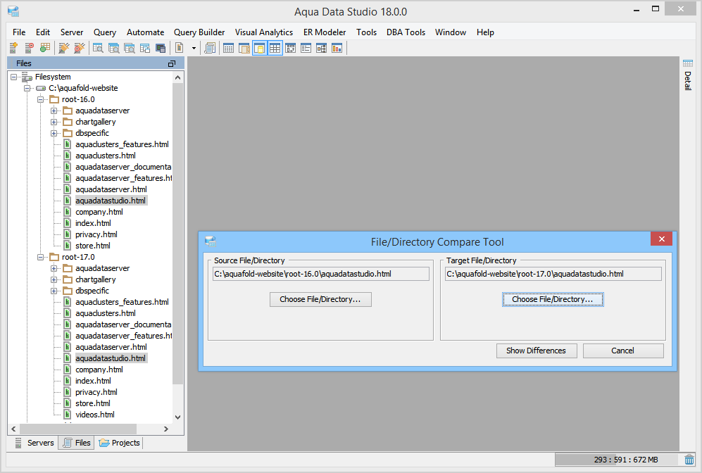 Aqua Data Studio provides six compare tools to easily compare database schemas, schema objects, queries, query results, files, directories, clipboard contents and version control history.