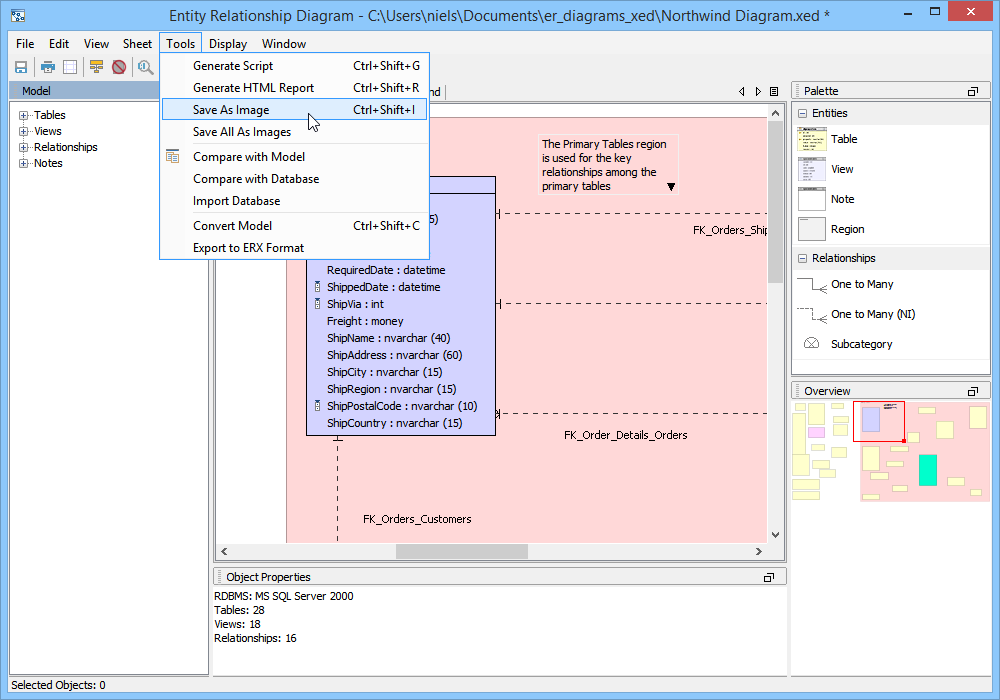 Save an ER Model as an image It is also possible to save the current sheet as a JPEG or PNG image. There are two methods of saving an ER Model as an image. 1. In the Menu Bar, go to Tools->Save as Image 2. Using the keyboard shortcut CTLR + SHIFT + I