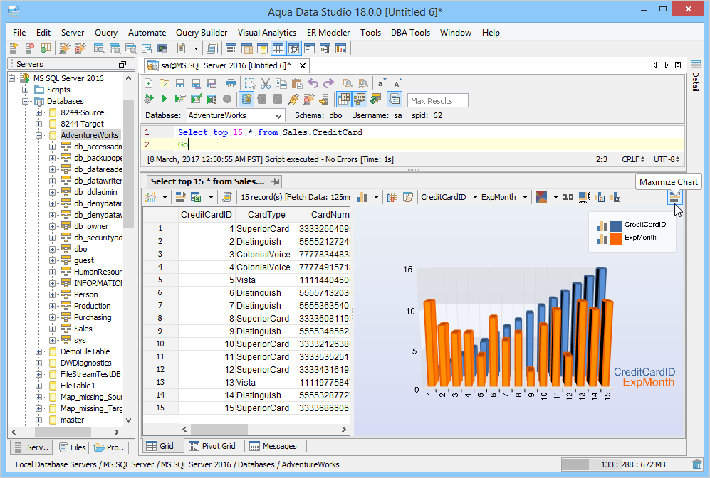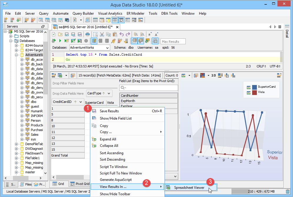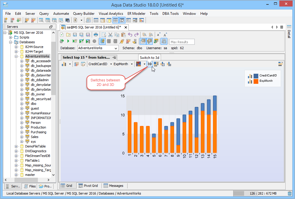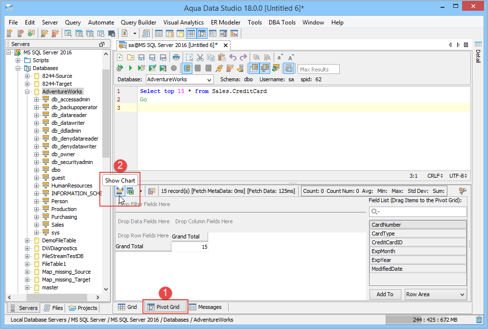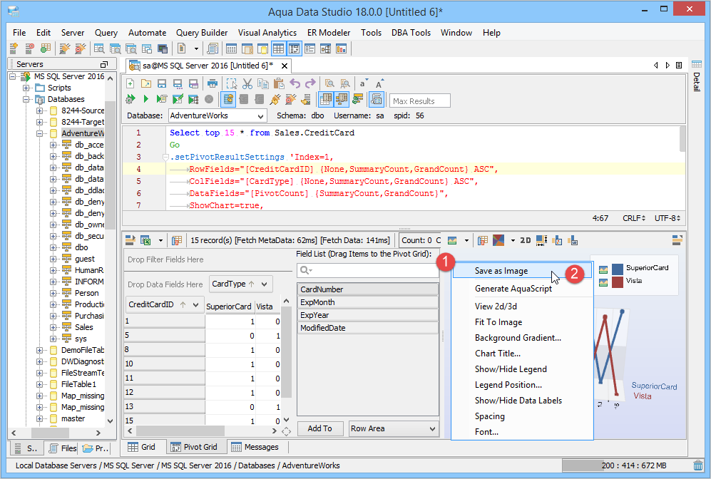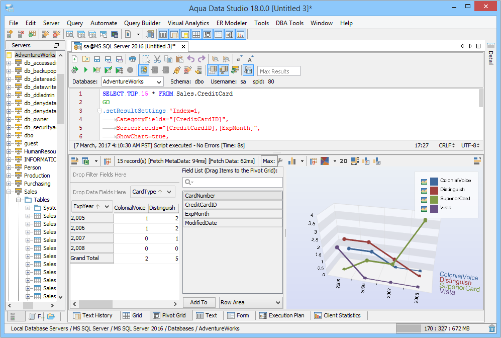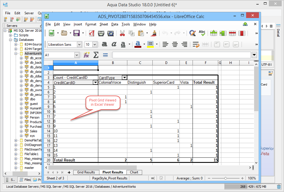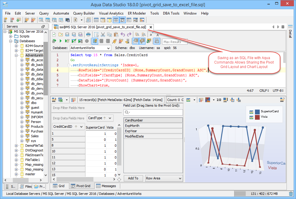 1. Connect to the Database Server and Open a Query Analyzer. Execute the Query. Click on the Pivot Grid Tab and click on Show Chart. 2. Drag Fields from the Fields list on the right into the Row Field area in the Pivot Grid's left side where it displays "Drag Row Fields Here" 3. Drag Fields from the Fields list on the right into the Column Fields area at the top of the pivot Grid where it displays "Drag Column Fields Here". 4. In the Chart display Area, select Column Chart Type. Change Chart Type if needed by selecting Column Chart, Stacked Chart, Bar Chart, Area Chart, Pie Chart, Line Chart or Surface Chart. The Chart Type can be set per series by clicking on the legend and choosing a different type. 5. Edit the Column Fields as needed. CardType is the Column Field and in the drop down, only 2 items from CardType are selected so that the columns are returned on the basis of this filter. 6. Select the Chart Type in the Chart Display Area. The Chart view can be freely rotated in three dimensions by left clicking and dragging the mouse across the chart. To zoom in and out, hold down shift and left click and drag up and down across the chart. To reposition the chart, Ctrl + drag moves the chart within the view. 7. Review the Aqua Commands script this chart would create within the Chart Options Script tab. If this script were shared with Aqua Data Studio users, they would see an identical chart layout. Just like the Grid Results Charts, a right click on the Chart allows saving as an image which can also be emailed. 8. Right click and select View in Excel Viewer to see how the Pivot Grid displays in Excel. 9. View the Pivot Grid viewed within Excel. 10. To save the Pivot Grid and the associated Pivot Grid Chart as an Excel Worksheet, right click in the Pivot and select Save Results or click the Save Results Icon. 11. To generate Aqua Commands to script both the Pivot Grid layout and Pivot Grid Chart, right click in the Pivot Grid and select Script to Window. Saving the Query Analyzer Window contents as a file preserves the layout and settings for later use. 12. Select Pivot Grid Options as needed, any changes take place immediately in the chart. Executing the contents of the Query Analyzer will update the chart and grid with any data that has changed since the previous execution. 13. Aggregate Functions like Sum, Count, Min, Max, Average, Standard Deviation are available for data selected from the Pivot Grid. 14. Just like the Grid Results Charts, a right click on the Chart allows saving as an image. 15. Save the Query and Aqua Commands script for generating the Pivot Grid and Pivot Grid Chart with layout for sharing or reuse. 16. Right click on a Pivot Chart to Generate an AquaScript. 17. Indicate a name and AquaProject to save it in. 18. The AquaScript Editor will open in a tab with that AquaScript. See the AquaScripts and AquaProject section for more information. Pivot Grid in Query Builder results - The Query Builder results also have a tab presenting the results as a pivot grid. The number of pivot grids corresponds to the number of result sets obtained when running the query. The pivot grids are displayed on a multi-level splitpane providing full control over sizes and configurations of each pivot grid. See the Query Builder section for more information. The Pivot Grid within the Query Builder has exactly the same functionality as the Pivot Grid launched from the Query Analyzer. |