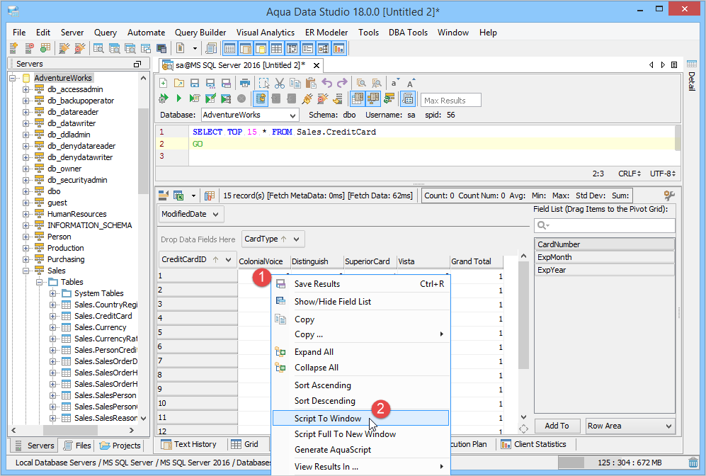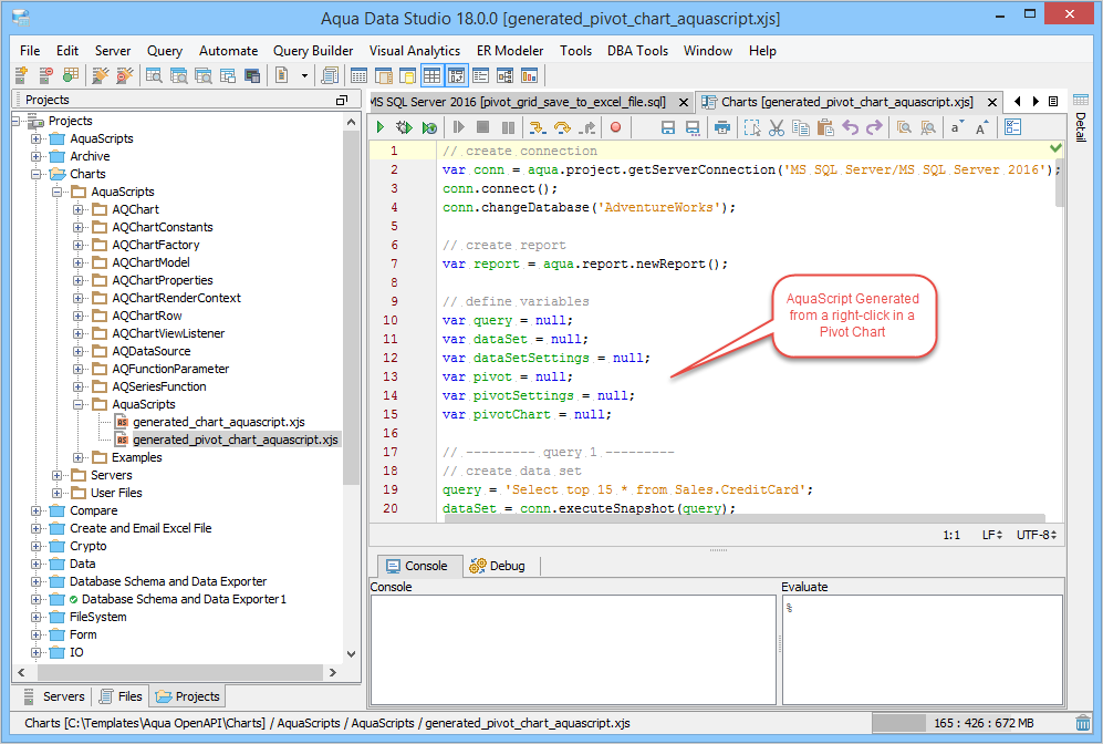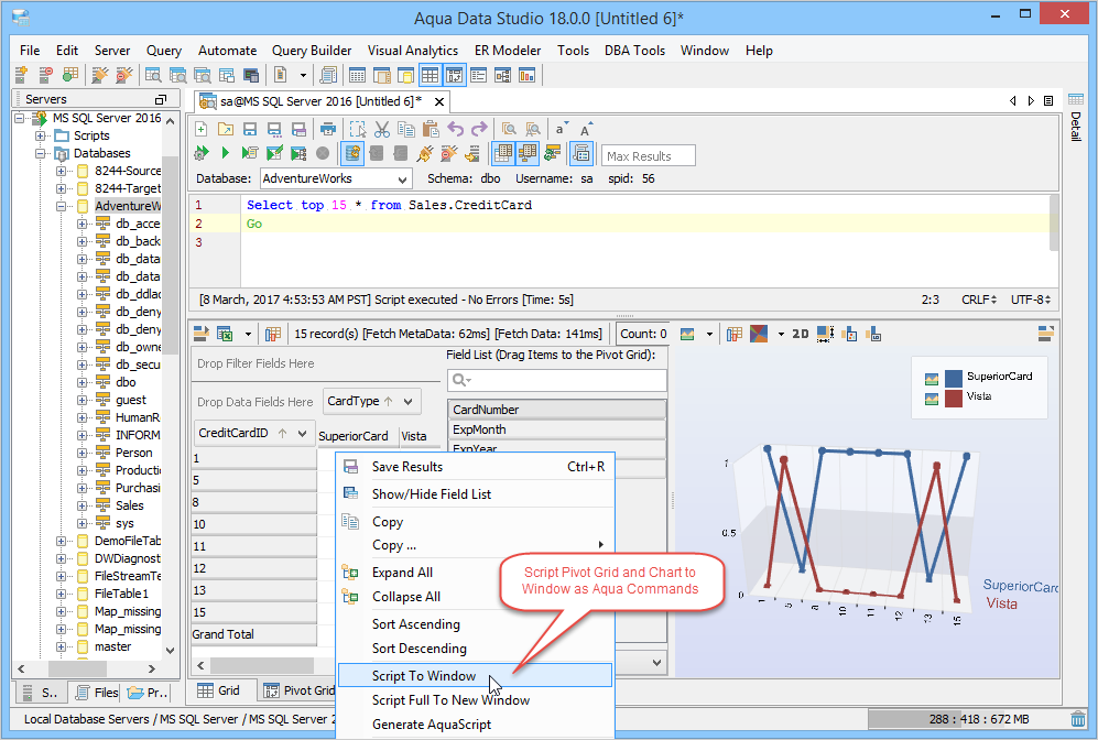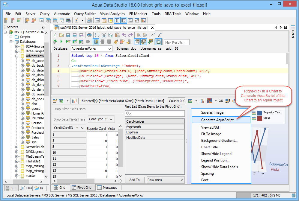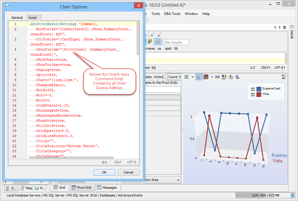 The Script to Window menu option automatically generates Aqua Commands for the pivot grid/pivot chart for exporting by right clicking within the grid view. This generated Aqua Command will include all of the settings of the grid/graph display. If these settings are stored with a query as a file, users can reexecute and generate the same grids and graphs again as many times as needed, and as data changes the chart dynamically changes with each reexecution of the query. Pivot Grids Results also have the Script to Window feature for generating Aqua Commands scripts.