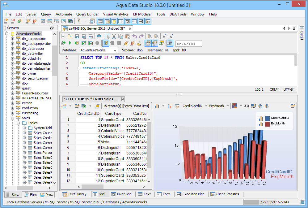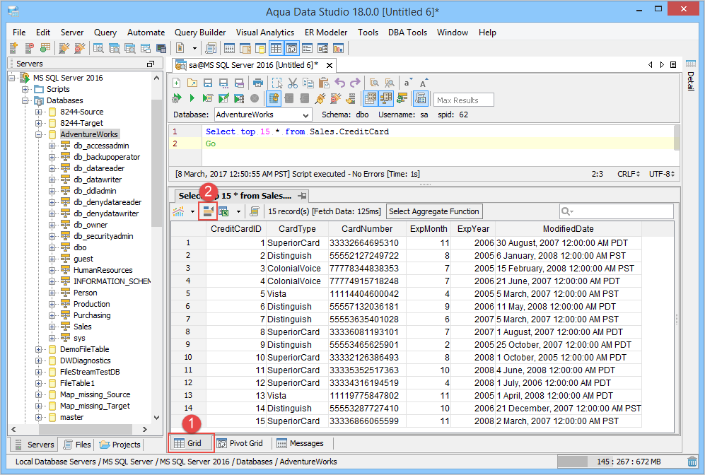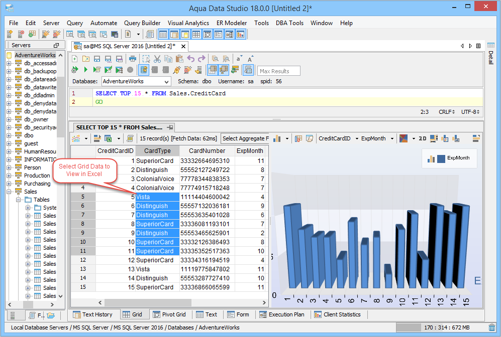 Grids, Grid Charts, Pivot Grids and Pivot Grid Charts are available through the Query Analyzer Window as tabs (when enabled in the Main Application Toolbar) for any queries run on any database Aqua Data Studio can connect to. Grid Results are the most common method of desplaying query results, and they are also the recommended method of displaying large results sets (100,000 rows or more) as memory consumption for them have been highly optimized. Other features of the Grids Results include sorting, column rearrangement, quickfiltering displayed results, aggregate functions on selected cells, Script to Window for AquaCommands, Save As, View in Excel Viewer, Grid Printing and Charting. It is also possible to save charts as AquaScripts within AquaProjects by right clicking on them. Grid results displays data from tables and queries within a grid that can be sorted and rearranged. Column data can be Sorted in descending or ascending order by left clicking on column headers. If the Control key (CTRL) is depressed during sorting, multiple columns can be sorted in sequence. Resorting columns also changes how the chart displays.
