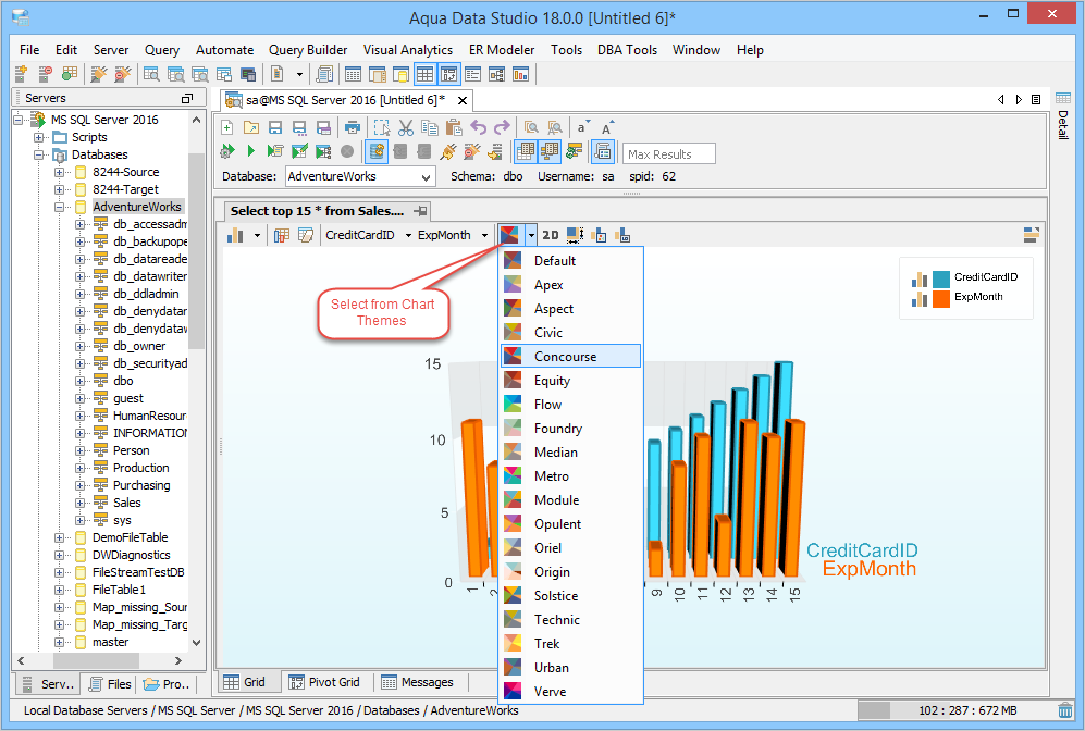 1. Connect to the Database Server and Open a Query Analyzer. 2. Type in the Query for which you want to view the Charts, in the Query Analyzer and Execute the Query. 3. Click on Grid Tab. To enable the Chart View Click on Show Charts Icon near records(s) [Fetch MetaData: /ms] [Fetch Data: /ms]. 4. The Chart Display Area is blank. 5. Select a Series in the Chart Display Area within the Chart's Toolbar. 6. Select a Category in the Chart Display Area within the Chart's Toolbar. 7. A chart is generated. Select desired Chart Options and Advanced Chart Options - Series such as series color, Legend Display and other options. 8. Maximize the Chart to check if its contents are what is needed. The view can be freely rotated in three dimensions by left clicking and dragging the mouse across the chart. To zoom in and out, hold down shift and left click and drag up and down across the chart. To reposition the chart, Ctrl + drag moves the chart within the view. 9. Change Chart Type if needed by selecting Column Chart, Stacked Chart, Bar Chart, Area Chart, Pie Chart, Line Chart or Surface Chart. The Chart Type can be set per series by clicking on the legend and choosing a different type 10. View the list of Chart Types and swap if needed. 11. The Chart changes immediately upon choosing a new Chart Type. 12. Select a different Chart Theme: Apex, Civic, Concourse, Equity, Flow, Foundry, Median, etc. 13. The 2D 3D button swaps the chart from a 2D chart to a 3D chart. 14. Right click on the Chart and to save it as an Image. 15. You can Script to Window, creating an Aqua Command script as part of the query 16. Saving this script, with the charting Aqua Command allows sharing of the chart with others who need to run the same query. 17. Right click on a chart to Generate an AquaScript. 18. Indicate a name and AquaProject to save it in. 19. The AquaScript Editor will open in a tab with that AquaScript. See the AquaScripts and AquaProject section for more information. Pivot Grid and Pivot Grid Chart Process Pivot Table concept and Aqua Data Studio's Pivot Grids - Pivot tables, discussed as Pivot Grids within Aqua Data Studio, allow the grouping and summarizing of selected columns and rows of data to obtain a desired report. They are particulary useful with large amounts of data, helping a user to classify data by categories and obtaining summaries without the time consuming search that it would normally take to look through all of the data. For more information on this see Wikipedia article about Pivot Tables. Pivot Grid configuration is persistent over multiple runs of the same query in the same query panel, i.e., if a user configures a pivot grid and then re-runs the same query, this pivot grid will maintain its configuration. As with the Grid Results, sort Ascending or Descending after a right click in data sorts it. Pivot Grids also allow sorting by Data Row Fields names, if for example all of the states of the U.S. were listed under an expandable row tab within the pivot. Sorting of either kind immediately affects the Chart. Pivot Grid configurations can be saved as XML layouts with a right click within a Pivot and those layouts can be loaded back into existing pivot tables. Saving as XML Layout does not include a Pivot Grid Chart's settings, it is only for the Pivot Grid.A full discussion of Aqua Data Studio's Charting Features can be found here. Below is a step by step process for creating Pivot Grids with Charts.