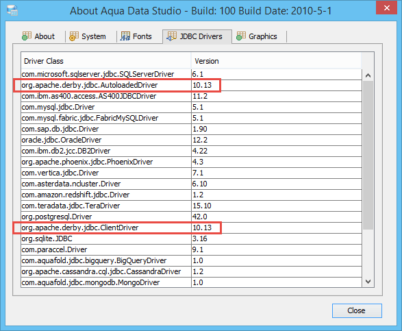The Apache Derby JDBC (v10.13) drivers included with ADS work across all versions of Apache Derby. Apache Derby server releases are frequent, and may sometimes require updating the JDBC driver.