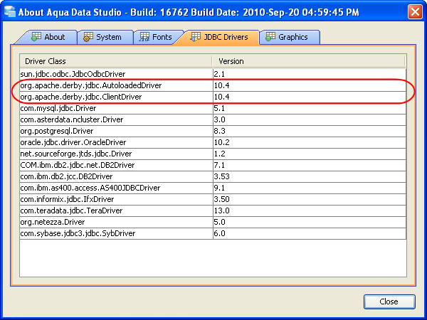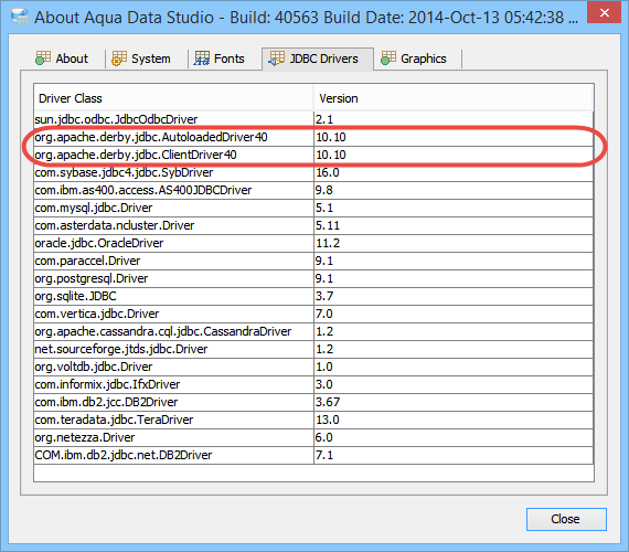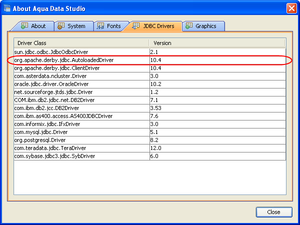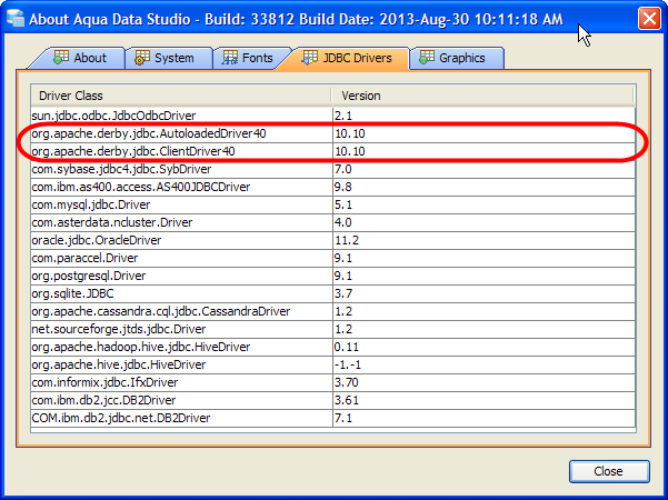 To update the Aqua Data Studio JDBC drivers for Apache Derby you need to overwrite the Aqua Data Studio derby.jar and derbyclient.jar files. Below is a listing of the Aqua Data Studio library directory [ADS_INSTALL]\lib\drivers\ ...