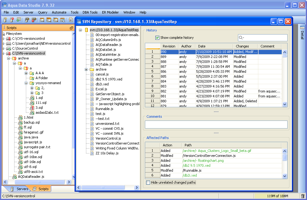 How to update a Version Control file or repository Within the scripts pane, right click on a repository, directory or file and select Update. This will retrieve the latest version from the remote repository. How to add a file to Version Control Within the scripts pane, left click on a file, files or directory to select, then right click to select "Add". This will include the selection in the repository for versioning. How to delete a file in Version Control Within the scripts pane, left click on a file, files or directory to select, then right click and navigate to "Version Control" to select "Delete". This will delete the selection from the repository. Within the Repository Browser, right clicking on an item and selecting Delete functions the same way. How to revert a file in Version Control Within the scripts pane, left click on a file, files or directory to select, then right click and navigate to "Version Control" to select "Revert". This will revert the selection in the repository. How to Show History in Version Control Within the scripts pane, left click on a file, files or directory to select, then right click and navigate to "Version Control" to select "Show History...". This will display the Version Control history of the selection in the repository. Within the Repository Browser, expanding the tree to select the file or directory you wish to view the history on, then left clicking it brings up its history in the History Table. The history displayed in the Repository Browser and the history displayed when selecting Version Control->Show History work similarly. Show History Dialog (window) Right clicking on a versioned item in the Files Browser gives direct access to show the history of that item. The resulting Show History dialog provides a list of all of the version control actions on a file or directory, and the revision's contained files. By default, the Show History Dialog only shows the most recent changes. If the "Show Complete History" option is enabled, all of the actions taken since the creation of the repository will be listed. Each action can be inspected in a table with columns for Revision, Author, Date, Changes and Comments. Two items in this history can be selected and compared to show the differences in actions and content over time. An item in the history can also be selected to "show changes" in the file as a comparison to its previous revision. Once a revision is identified within the History, right clicking on it also allows a checkout of that specific revision or a revert to that specific revision. At the bottom of the Show History is an area displaying affected paths of a revision, with an option for hiding unrelated changed paths. The Subversion (SVN) Repository Browser is a convenient way to view all of the contents of a repository, even when no working copies have been mounted locally. While the Repository Browser shows details on item history, it does not show the status of local working versions. It is more for exploring the remote repository and its contents than managing the local versions of files. To Launch the Repository Browser, right click on an item in the Files Browser and select Version Control -> Browse Repository. A window appears with the url to the repository in its title. An expandable tree view appears on the left and a history for the selected items in the tree appears on the right. The Subversion (SVN) Repository Browser points to the repository root when launched and offers an in-depth, explorable view of all of the files in a repository without requiring a local version of its content. The repository is displayed as a tree where action can be taken on individual items, or they can simply be viewed. The History table within the Repository Browser allows opening and comparing of individual items by way of a popup menu. Tree content is obtained with a background thread so that Aqua Data Studio’s other tools can be used while information from the repository is being retrieved. In the Affected Paths display, unrelated changed paths can be hidden. Inside the tree, right clicking on items allows checkout, new remote folder, rename, move, branch, delete, copy url and refresh. The Browse Repository menu item invokes the browser, pointing to the repository root, showing a tree, history table, and a "show complete history" checkbox for viewing the complete history of items in the repository. Clicking on item in the history table can also shows affected paths when it is enabled. Repository Browser Tree popup menu Right clicking within the repository browser launches a menu with checkout, new remote folder, rename, move, branch, delete, copy url, and refresh menu options. Repository Browser History Table and popup menu The Repository Browser History contains much of the functionality of the Show History Dialog mentioned above. Clicking on items within the Repository Browser History Table brings up menu options for show changes, compare, open, compare with revision, compare repository revisions. The history content is obtained in a background thread, allowing Aqua Data Studio's other operations to continue uninterrupted. Additional Subversion features