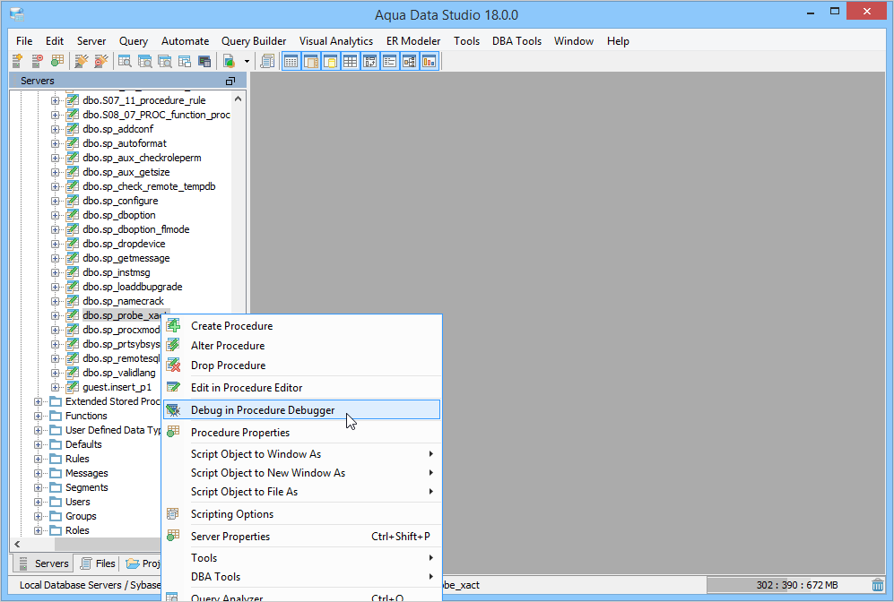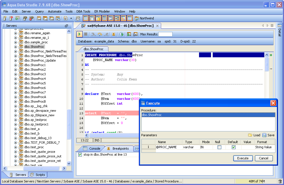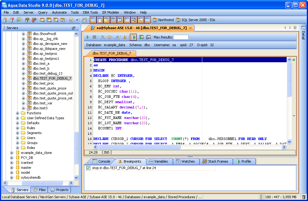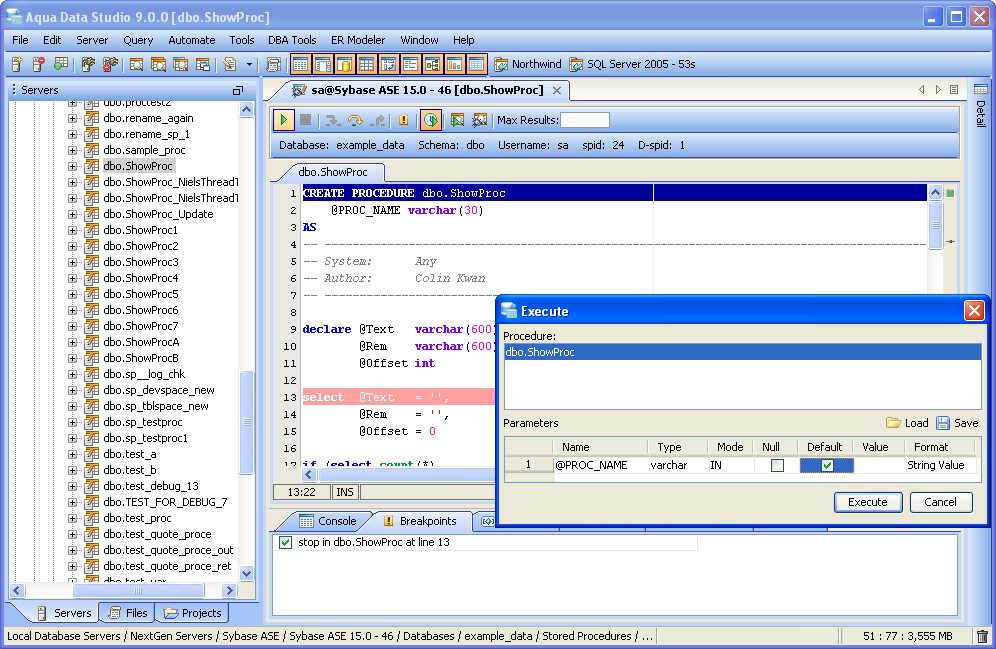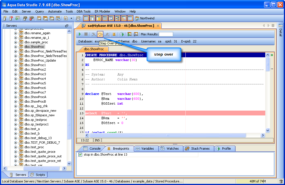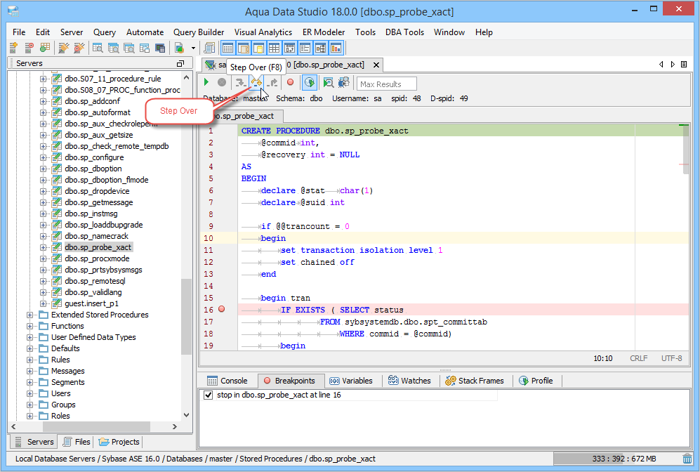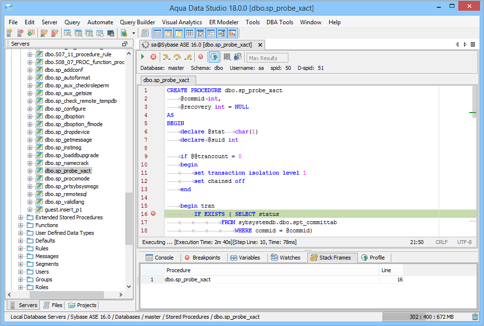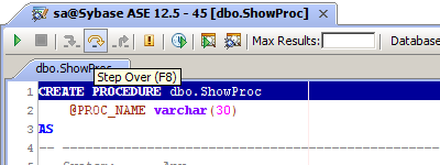 The Sybase SQL Debugger has been designed to help with testing and debugging of SQL functions and procedures for Sybase ASE version 12.5 and above. Launching the Sybase SQL Debugger The Sybase SQL Debugger is launched through a right click in the Schema Browser on Stored Procedures or User Defined Functions and selecting Debug from the popup menu. More than one debugger can be open at once, with each object to be debugged opened in a separate tab. Debugger Workspace The debugger displays a slightly modified version of the Query Analyzer Toolbar containing debugger specific menus and buttons. Along the top of the debugger are the Execute, Stop, Step Into, Step Over, Step Return, Toggle Breakpoint, Turn On Profiling, Target Query Window, Debugger Query Window buttons. Next to the buttons is the Display Max Results input field. Beneath the buttons is the connection information, username and SID information. The procedure or package displays in the debugging window, within which breakpoints can be added by right clicking and selecting "Toggle Breakpoint" from the popup menu. When this window has focus, and a line has been clicked, it is also possible to select "Run to Cursor," to run the debugger up to that line in the procedure. From the same popup menu, "Go to Current Line" brings the cursor to the current line, which is very useful when debugging multiple lengthy procedures. Below the debugger window are tabs for Console, Breakpoints, Variables, Watches, Stack Frames and Profile. The Console tab displays any errors or messages generated as debugging progresses. The Breakpoints tab indicates the lines of the procedure where breakpoints are set and allows them to stop execution or not. The Variables tab lists any variables by name, their value and type. The Watches tab allows selecting specific variables to be observed as they change, reducing from a possible list of hundreds to a select group. The Stack Frames tab lists the local variables of the functions, and the arguments to them. The Profile tab lists commonly used terms or values a user works with on a regular basis in the debugging process. Once execution of a procedure has begun through the use of the Start button at the top of the debugger window, the bottom left of the window is occupied by the Text, Text History, Grid, and Pivot Grid Results tabs. This area functions just as the Query Analyzer window does, revealing the results of procedures at each breakpoint or execution cursor. The Sybase SQL debugging features include: