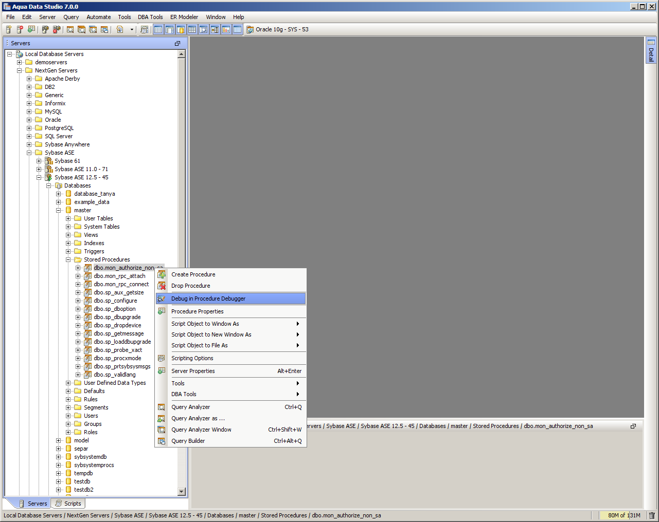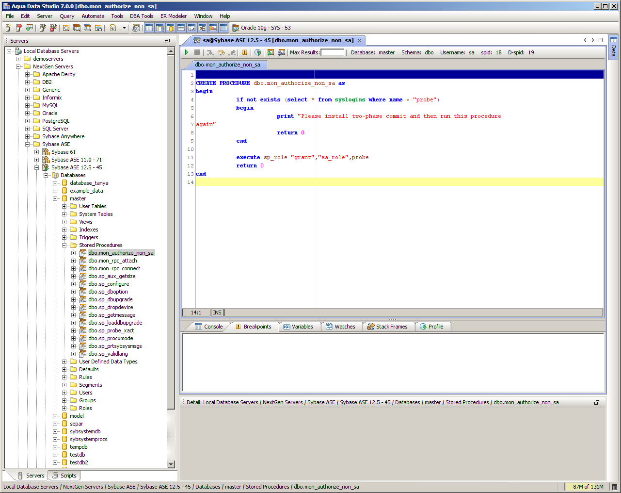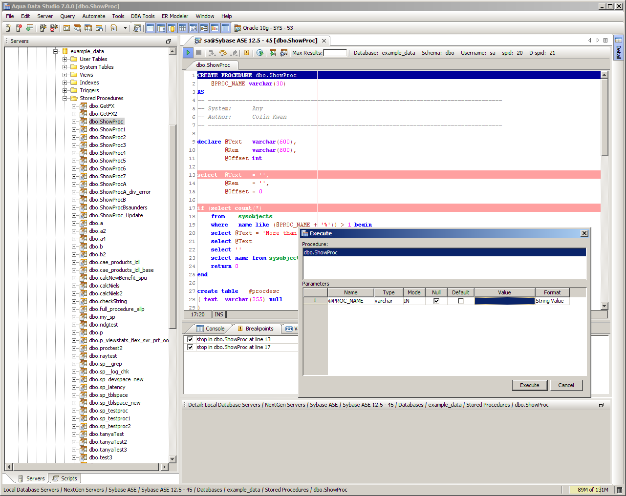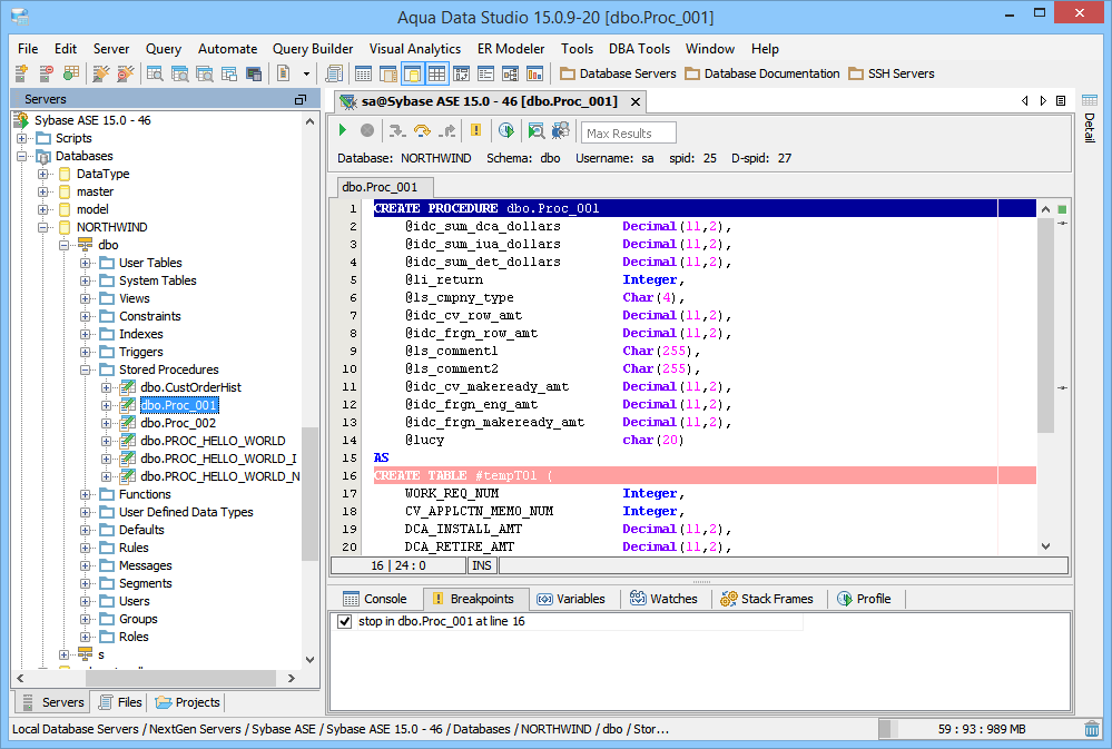 The Sybase SQL Debugger has been designed to help with testing and debugging of SQL functions and procedures for Sybase ASE version 12.5 and above. Launching the Sybase SQL Debugger The Sybase SQL Debugger is launched through a right click in the Schema Browser on Stored Procedures or User Defined Functions and selecting Debug from the popup menu. More than one debugger can be open at once, with each object to be debugged opened in a separate tab. Debugger Workspace The debugger displays a slightly modified version of the Query Analyzer Toolbar containing debugger specific menus and buttons. Along the top of the debugger are the Execute, Stop, Step Into, Step Over, Step Return, Toggle Breakpoint, Turn On Profiling, Target Query Window, Debugger Query Window buttons. Next to the buttons is the Display Max Results input field. Beneath the buttons is the connection information, username and SID information. The procedure or package displays in the debugging window, within which breakpoints can be added by right clicking and selecting "Toggle Breakpoint" from the popup menu. When this window has focus, and a line has been clicked, it is also possible to select "Run to Cursor," to run the debugger up to that line in the procedure. From the same popup menu, "Go to Current Line" brings the cursor to the current line, which is very useful when debugging multiple lengthy procedures. Below the debugger window are tabs for Console, Breakpoints, Variables, Watches, Stack Frames and Profile. The Console tab displays any errors or messages generated as debugging progresses. The Breakpoints tab indicates the lines of the procedure where breakpoints are set and allows them to stop execution or not. The Variables tab lists any variables by name, their value and type. The Watches tab allows selecting specific variables to be observed as they change, reducing from a possible list of hundreds to a select group. The Stack Frames tab lists the local variables of the functions, and the arguments to them. The Profile tab lists commonly used terms or values a user works with on a regular basis in the debugging process. Once execution of a procedure has begun through the use of the Start button at the top of the debugger window, the bottom left of the window is occupied by the Text, Text History, Grid, and Pivot Grid Results tabs. This area functions just as the Query Analyzer window does, revealing the results of procedures at each breakpoint or execution cursor. The Sybase SQL debugging features include: