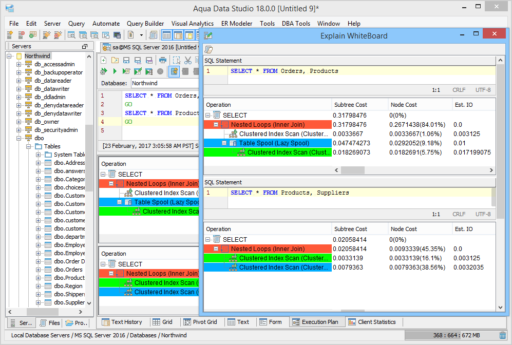 Execution Plan - Execution Plans display detailed statistics on the execution cost of the statement or script. A color coded visual execution plan will be generated for each query executed in the Query Analyzer. Subtree Cost, Node Cost, CPU cost, Estimated Input/Output, Estimated Rows, Executes, Argument, Type, Average Row Size, Defined Values, Output List, Warnings, Parallel, Estimated Executions, Physical Operations, Logical Operations and Statement Text are presented in a table. The contents of an Execution Plan can be added to a Visual Explain Whiteboard so that comparisons can be made to query variations. Execution Plans are extremely useful in query tuning for speed optimization. Read more about Execution Plans and the Visual Explain Whiteboard here. |