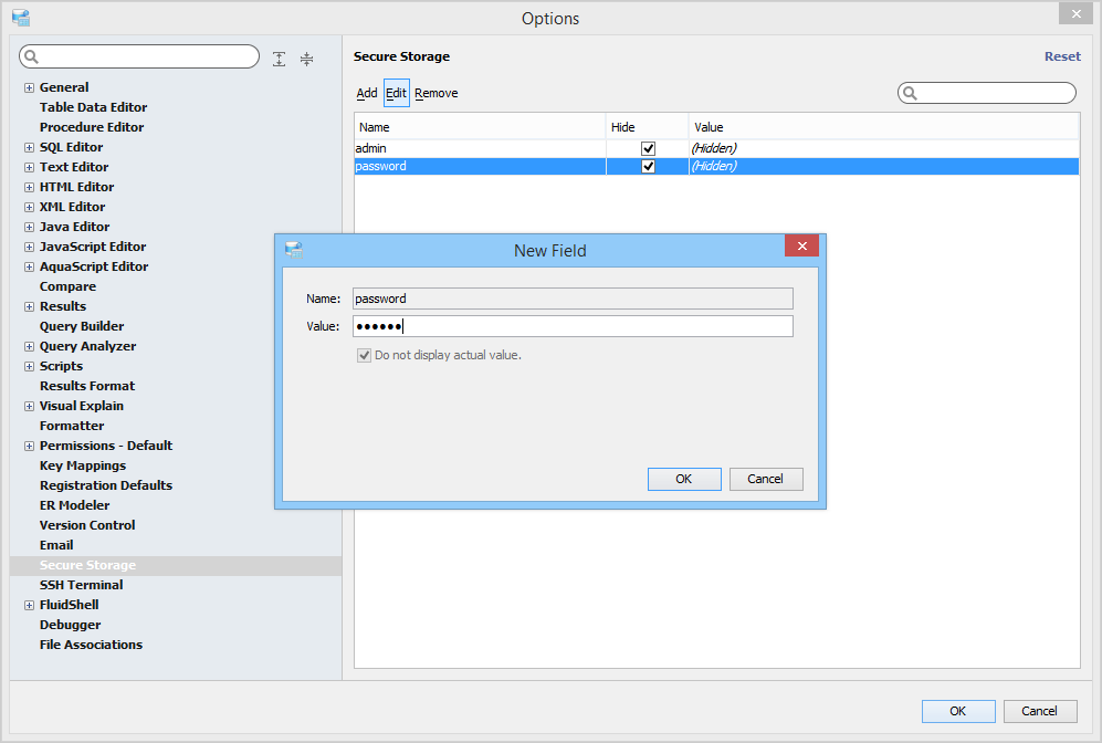 Secure Storage The Secure Storage option allows storing opaque objects (which can hide values on display in the editor) for use within AquaScripts. Its purpose is not to reveal stored text to the user or script, but to pass it to an AquaScript function. This allows scripts to programatically access and use these objects to pass opaque values securely. This interface represents an opaque object, for example a password, which can be passed to various OpenAPI methods without revealing the content to the script code. Values can be added, edited and removed. |