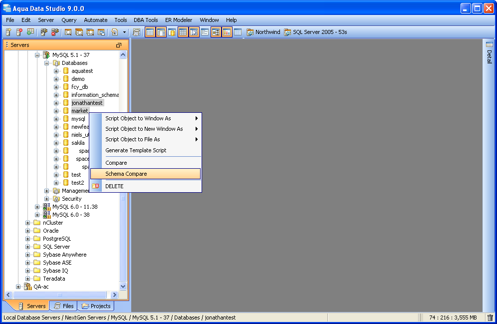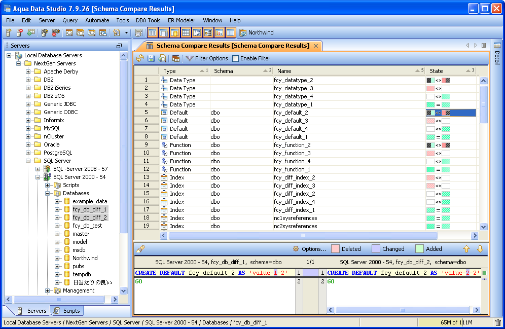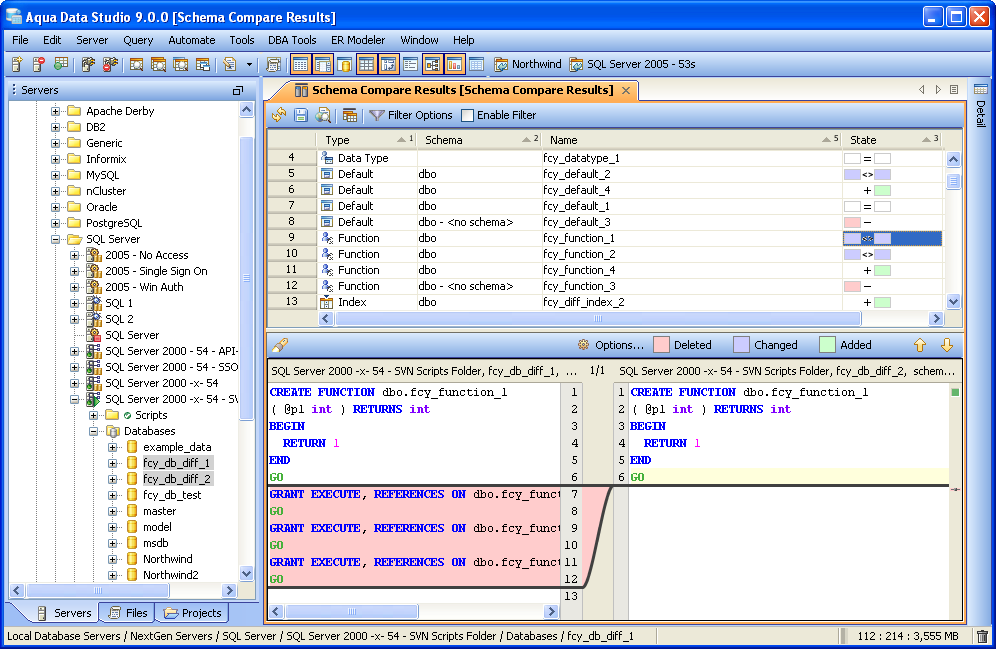 There are two different types of Compare for Database Schemas; Schema Compare for schema objects and Compare for schema DDL. Schema Compare (schema objects) can be done with a multi select of two databases in the Schema Browser, or with the menu Tools->Compare Tools->Schema Compare. With the Schema Compare Tool it is possible to compare individual objects, including databases, tables, triggers, indexes and more within different databases. A full discussion of the Schema Compare Tool is found on the Schema Compare Tool page. Once a Schema Comparison has been performed, it is also possible to compare database data. See the Compare Schema Data section of the Schema Compare page for more. Compare (DDL compare) of two database schema objects can be done with a right click on the two schema objects in the Schema Browser and selecting Compare from the popup menu. Aqua Data Studio generates the DDL comparison as a Query Results Comparison, placing the DDL of each selected schema object side by side with splines and adjacent line numbering. Just like the other compare tools, each difference is color highlighted to indicate Deleted, Changed and Added. Character-level differences are marked with text bolding. Along the right side of the comparison results the Annotation Bar bookmarks changes with colored lines for quick navigation. See the page on the Query Results Compare Tool for a complete description.