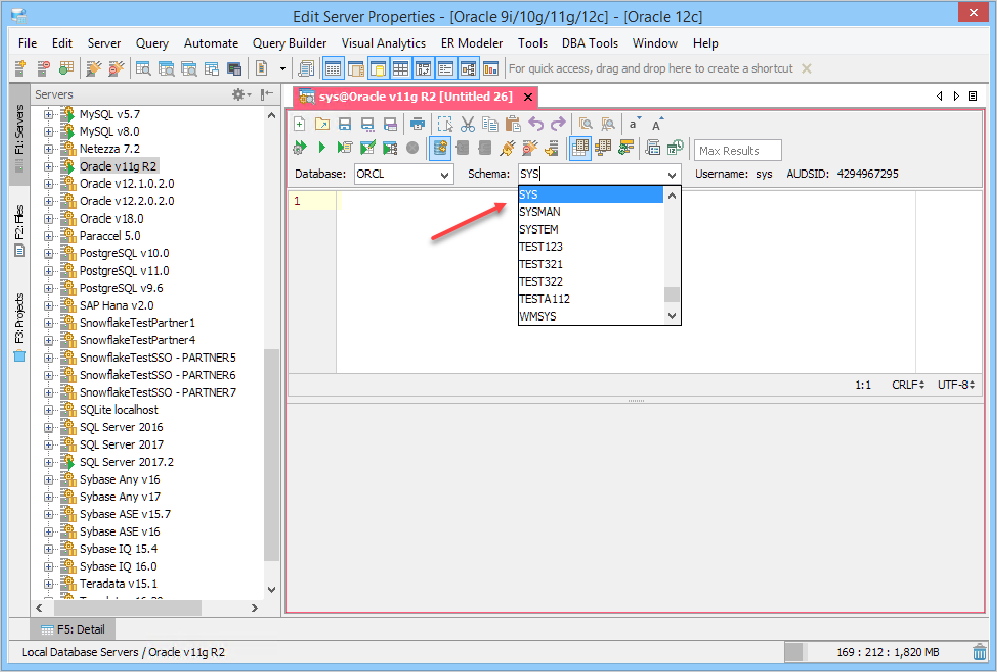 If you have a large number of schemas on an Oracle Database the connection process can take a long time. If you want to improve the connection performance or simply limit the number of schemas displayed in the Schema Tree or in the Query Analyzer schema drop-down you can follow the steps below: