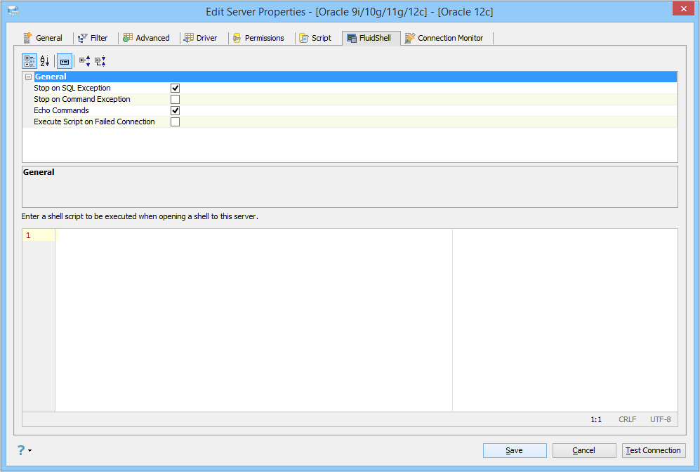 Edit Shell Scripts in Server Properties in Aqua Data Studio: