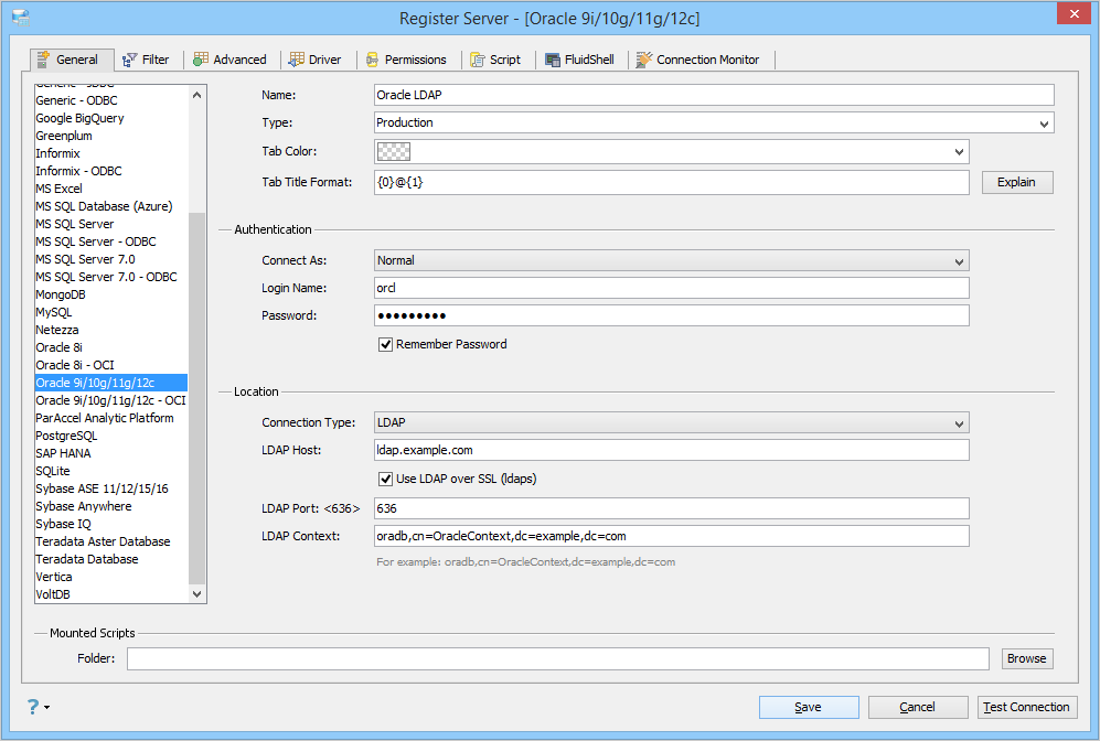 The UI supports three connection types for Oracle: Basic, TNS Descriptor and LDAP.