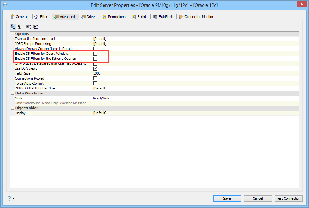 Checking the box next to "Enable DB Filters for the Schema Queries" option enables the schema filter configuration and applies it to the WHERE clause of the query that extracts the list of schemas from the database.
