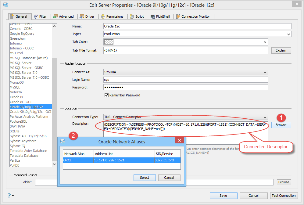 Aqua Data Studio also allows you to connect to Oracle RAC and Oracle Connection Manager by entering into the TNS Descriptor: