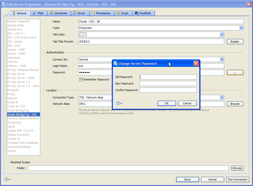 Browse to select a network alias from the tnsnames.ora file. TNS - Network Alias uses the Environment Variable TNS_ADMIN is used and if it is not found, the Environment Variable ORACLE_HOME is used to find the tnsnames.ora file.