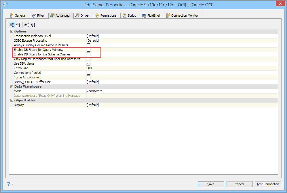 Checking the box next to "Enable DB Filters for the Schema Queries" option enables the schema filter configuration and applies it to the WHERE clause of the query that extracts the list of schemas from the database.