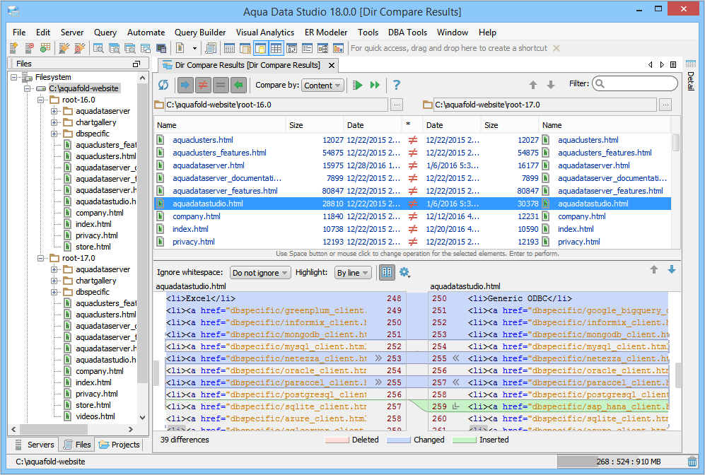 . The contents of the selected file are shown in the lower pane, also known as the Differences pane with the differences highlighted. This pane is further split into a split-pane where each file takes up half of the pane and shows connecting splines for identifying where the deletions, changes and additions occur. Comparisons show the character differences in a modified line with bolding and background color highlights indicate modified blocks. If they are not identical they are highlighted by default in pink (deleted), purple (changed) or green (added). These colors can be changed from the Options dialog. You can also use this tool to synchronize the contents of the directories