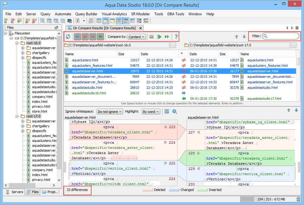 Directory Compare provides a method of identifying differences between contents of the directories and supports synchronizing selected or all differences of the selected files.