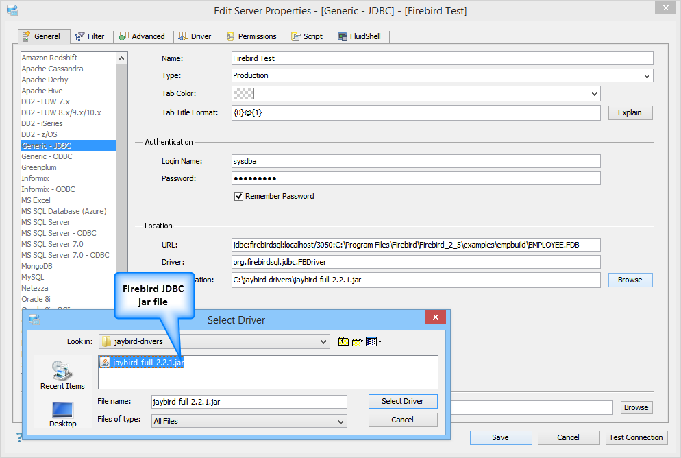 JDBC Drivers for Firebird must be downloaded from the vendor and are not bundled within Aqua Data Studio. Each registered Firebird server in Aqua Data Studio requires the use of the Generic JDBC connection type and the jaybird-full-x.x.x.jar Firebird JDBC driver that is written for the version of Firebird you have installed.