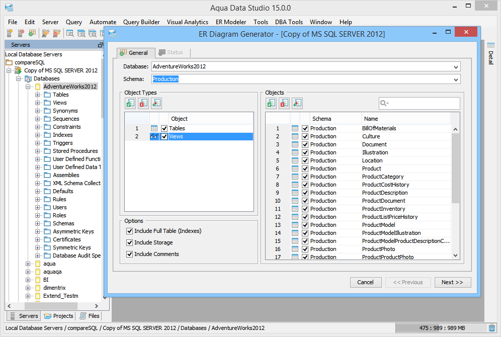 The Entity Relationship (ER) Diagram Generator helps users achieve a better understanding of their database schema by displaying the structure in a graphical format. The ER Diagram Generator uses the fully-featured Entity Relationship (ER) Modeler to create saveable, editable and exportable .xed diagrams that can be shared as part of a version control repository. See the full documentation on the Entity Relationship Modeler here for more on how to forward and reverse engineer database, migrate database and export for ERWin and Visio. Below are instructions on how to launch the ER Diagram Generator from the Main Appliction Menubar and the Schema Browser. 1. Launch the ER Diagram Generator dialog by Selecting ER Modeler->Generate from the Menu Bar or Selecting Tools->ER Diagram Generator from the right-click pop-up menu on a database object in the Schema Browser. 2. In the ER Diagram Generator dialog select a Database and Schema (or All Schemas). In the left panel, select one or more of the Object Types to be diagramed (Tables, Views or Both). Click the green check button to select all and the red X button to deselect all. All objects matching the selected schema and object types will appear in the right panel. Select one or more objects to be diagramed 3. Click Next to generate the diagram. The Status Tab will display with information on the diagram's creation including elapsed time, time remaining and number of objects diagrammed. Once the diagram is generated, the ER Modeler will open and display the new diagram. All of the table entity objects created can be edited, repositioned and exported. See the ER Modeler section for the full details on its capabilities and features. |