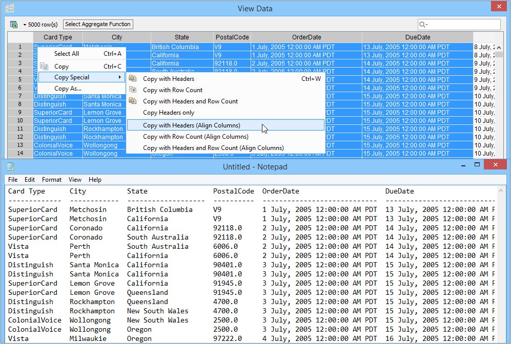 | Copy with Headers (Align Columns) | Copies column headers and data and retains the column alignment in the destination file. See Attachment. |