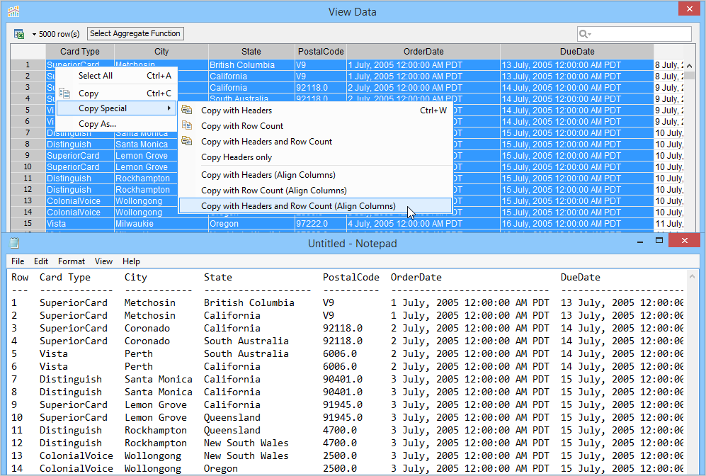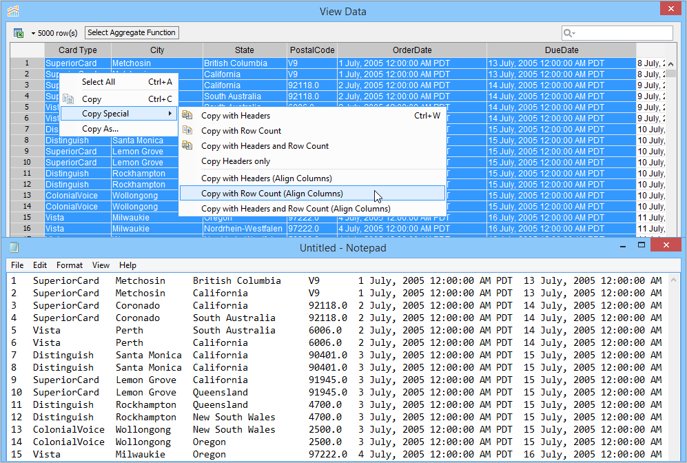 | Copy with Headers and Row Count (Align Columns) | Copies column headers, row counts, and data and retains the column alignment in the destination file. See Attachment. |