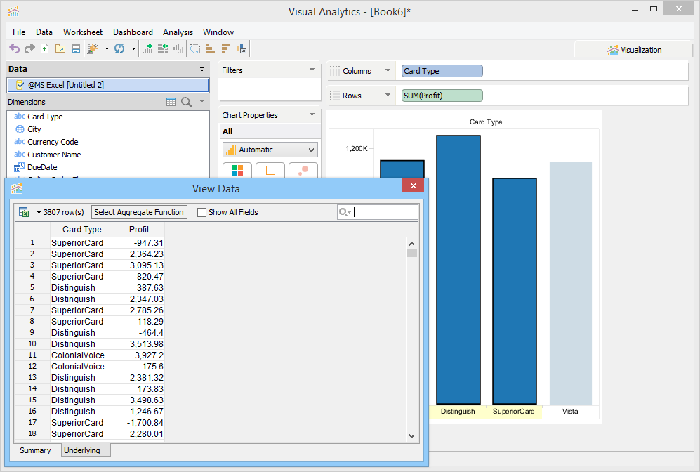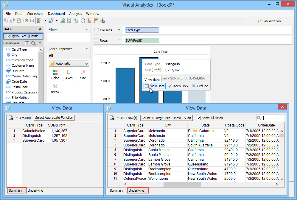 When you hover your mouse in the chart view, or in the Color or Shape legend, Visual Analytics opens the View Data after you click the icon on the tooltip. This window contains the summarized and underlying data of the selected data points. The following screenshot contains the summarized and underlying data of multiple data points, such as; ColonialVoice, Distinguish, SuperiorCard. The Summary tab shows the aggregated values of each data point. The Underlying tab shows the disaggregated values of the data points across all dimensions and measures.